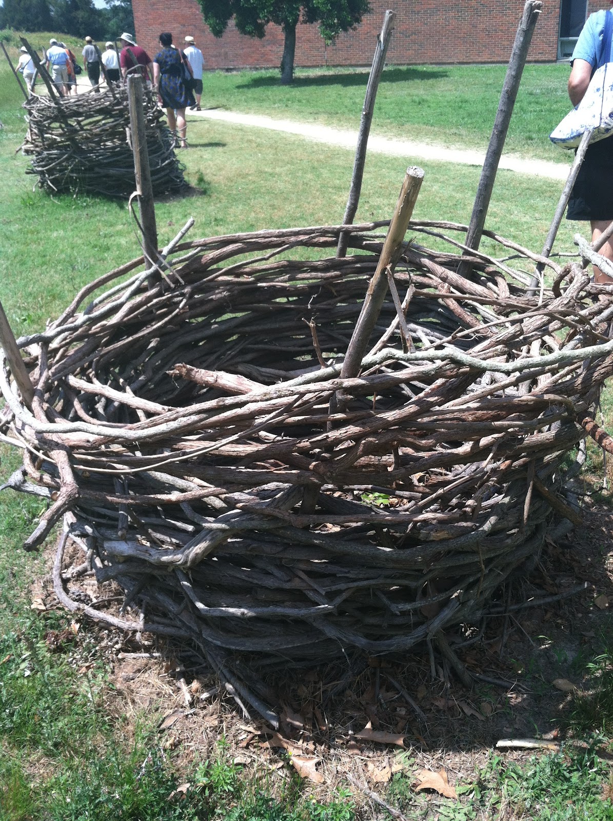 The first picture is a gabion, which is a woven basket made out of wicker material. These gabions would of been filled with dirt and then covered in more dirt to create the earthworks. The gabions created extra stability for the large mounds for not only artillery but for the weather as well. The next picture is a great example of what the earthworks look like.