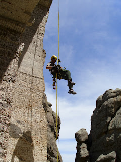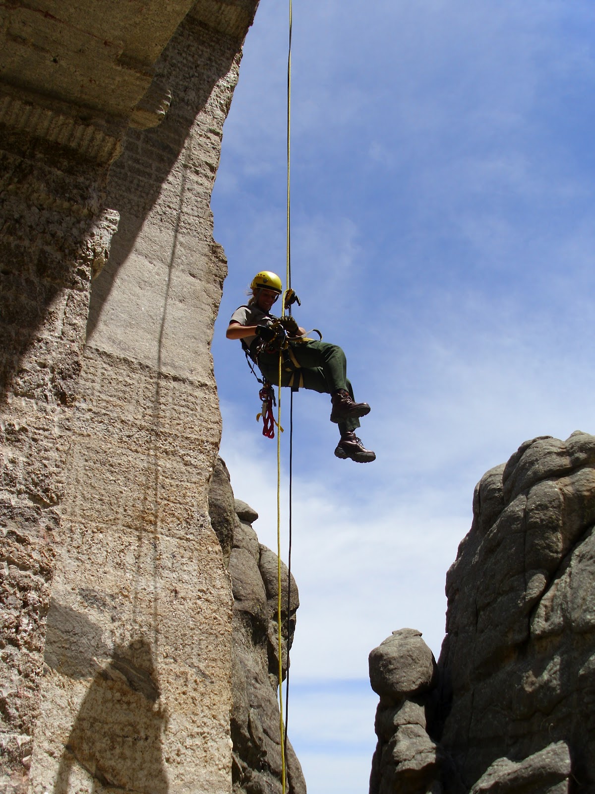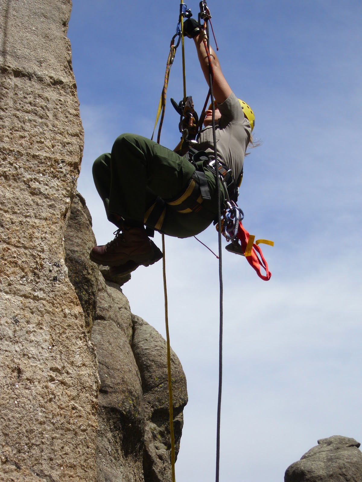 The climbing equipment that they use is top of the line and a lot different from the types we have used for rappelling at Leadership Camp. Their gear is designed for when you are free hanging and unable to climb up actual rock; for example when they are going over the face of Lincoln they are simply free hanging in front of his face. The gear that I was being taught with consisted of an ascender with a hand grip, descender, a foot strap, and a shunt. To climb up, you typically use the ascender with the hand grip and foot strap and to lower yourself back down you can use the descender. However, both devices can be interchangeable and can do both functions. The shunt is used as a safety device to ensure that you always have two points of contact on the rope to prevent you from any falling accident. To climb up, you slide the ascender up the rope and while holding onto the hand grip you essentially “stand” in the foot strap. You continue with this mechanism until you reach the desired height. To come back down, you have to switch out the ascender with the descender; this can be pretty tricky the first couple times you try it. After doing this a few times I was finally able to get the hang of it. Once the descender is attached properly you pull down on the rope lock and slowly lower yourself down. It was so great to see and use a climbing technique that I was not familiar with and I am greatly looking forward to the next time I am able to climb!