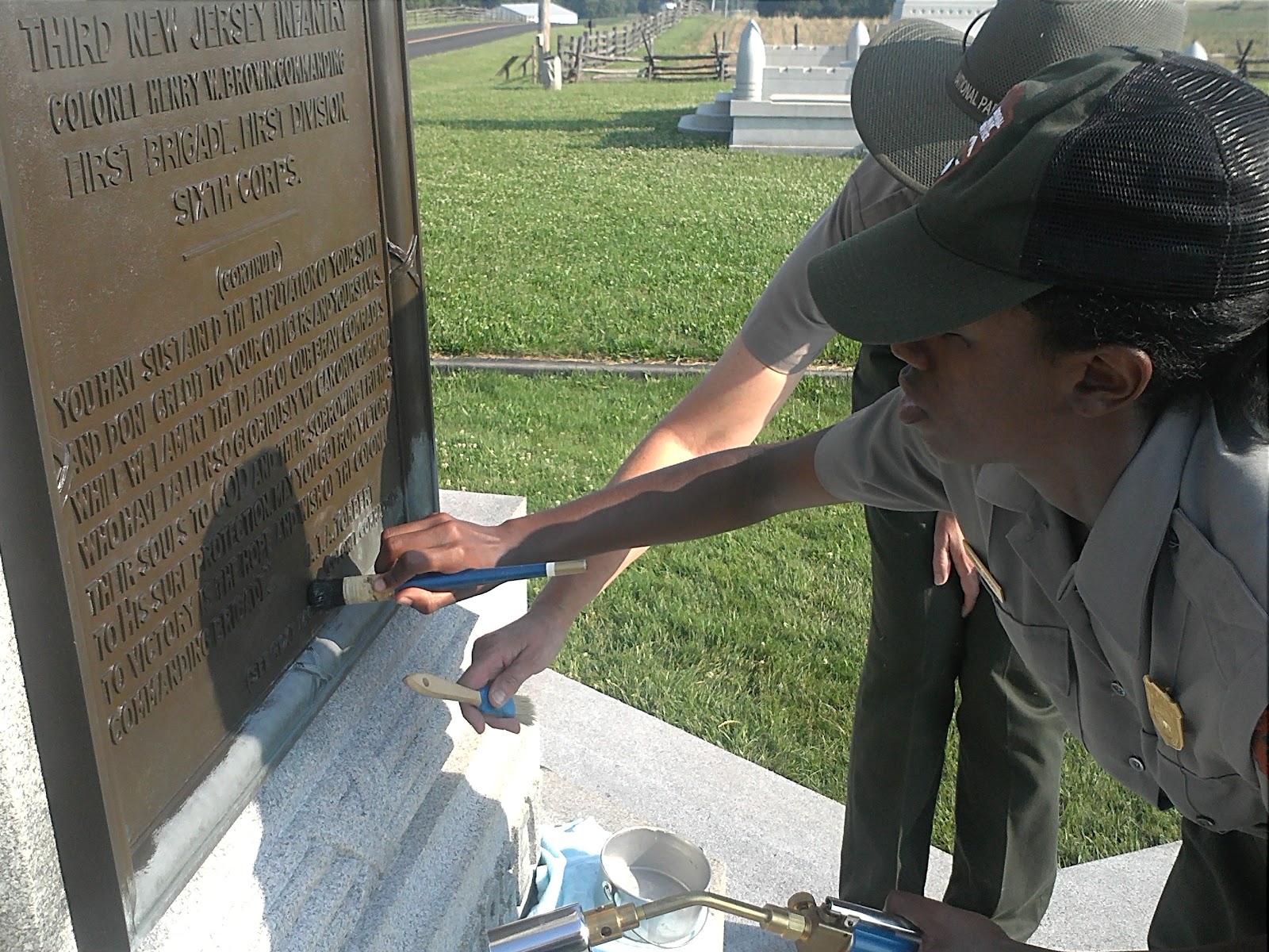We began the restoration process by cleaning the actual monuments the bronze plaques were on (the stone parts). We sprayed the stone with water and a solution that is slightly stronger than DAWN dish detergent. Monuments that needed more work or that were covered in linchen- a kind of dark green moss that looks like green veins on the sides of the monuments- we sprayed with a stronger chemical called D2. D2 was invented by the same man who thought of the Green Solutions cleaning products, so while the D2 chemical was excellent at cleaning the monuments, the chemicals in it were relativley mild. After we sprayed the D2 solution we let it sit for a minute and then we scrubbed the monument with scrub brushes. All this cleaning was preparation for the second phase in the monument restoration process: waxing. Wax is used on the bronze portion of many monuments because it acts as a protective coating against rain, snow and other elements. The process of applying wax was an experience I will never forget. We had to use a torch to heat the bronze surface of the monument, then quickly apply the wax with large paint brushes. One thing we had to remember was to move the torch either in circles or back and forth as we applied the heat so as not to burn the monument. I was nervous because I don’t have too many problems burning toast when I cook breakfast. But with the help of the cultural resources staff and my partner Jay Copper, I did alright. We all worked together on the New Jersey Monument and the New York Monument in the park. I personally think you should all travel down to Antietam to see the beautifaul, shiny monuments we worked on.