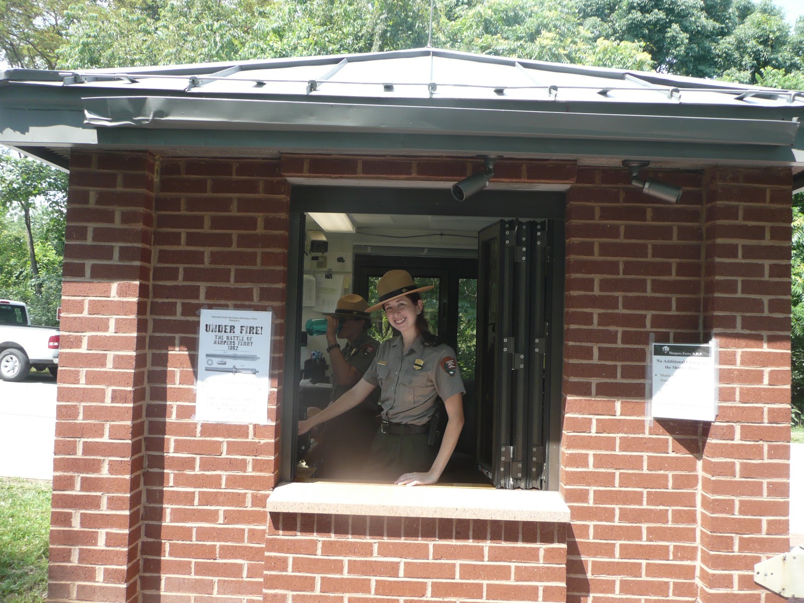 We started this week off with Education. The Congressional Youth Leadership Camp (CYCL) involves children from various middle schools across the nation who are nominated by a teacher to participate in this program. It involves many learning experiences, one of them being at Harpers Ferry. It was a great opportunity to take part in seeing the learning activities and experiences the children can obtain from the park. Over 200 kids are split in to different groups, one being the military station where I (Jackie) worked at. The kids received wooden rifles and costume confederate uniform hats, as they get a small taste of what life was like being a confederate soldier with the training and drills. The citizen station is where I (Renee) became the Sergeant of the Provost Guardsman for the day. The primary duty of the Provost Guardsmen was to put citizens in jail for not having proper identification, union spies, if a person looks or acts suspicious. The children experienced how life was like for citizens of Virginia in the 1800’s. Later that day we took a bus trip to South Mountain with a group of teachers and an educator that is employed at Harpers Ferry NHP. These teachers are taking a course about what was going on in these towns here during the civil war, and the important battles. We were able to see some vital battle sights that are located around Harpers Ferry.