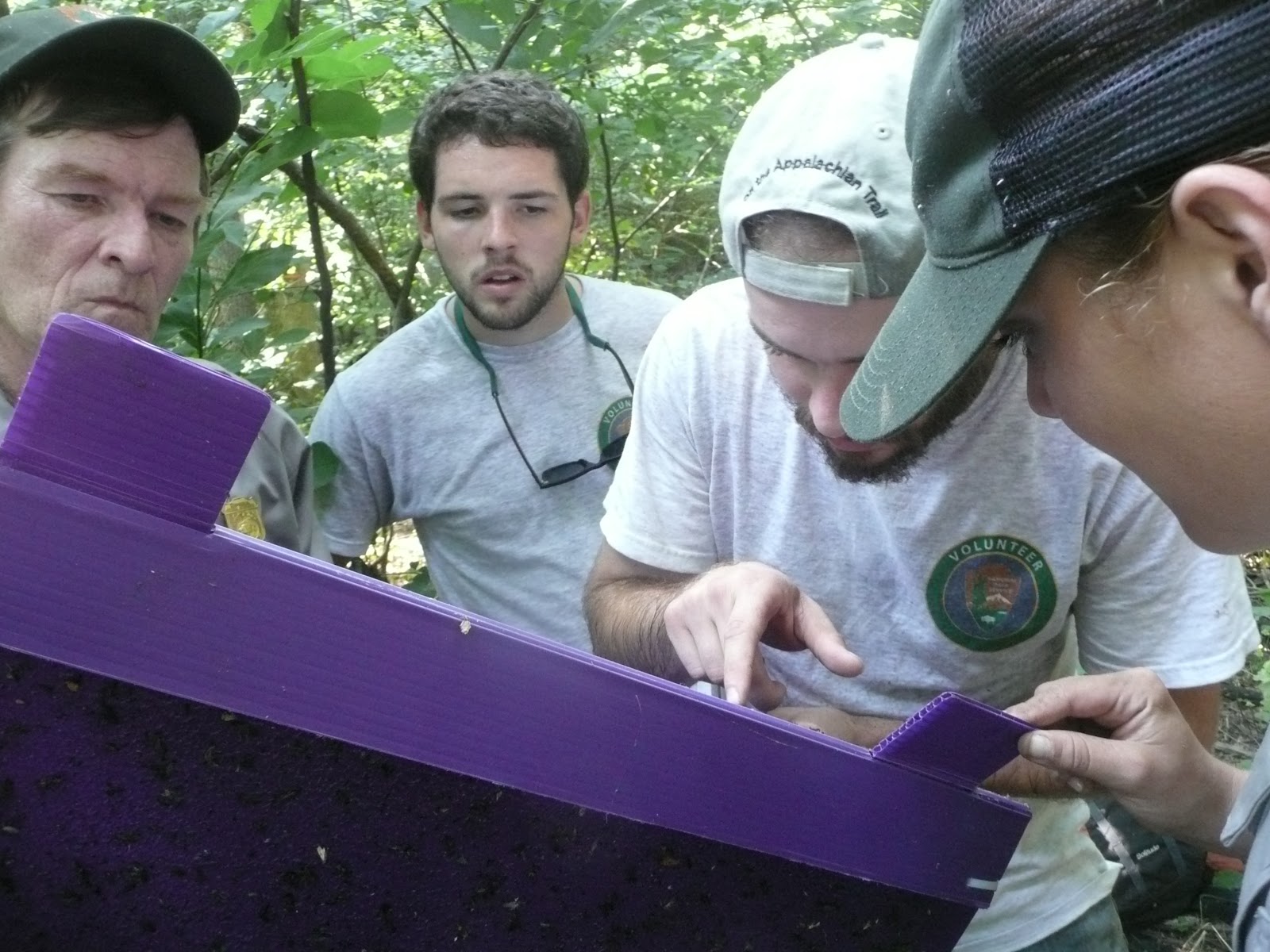 The next day we worked with Dale Nisbet from the Natural Resources Division. We went to Short Hill, a hidden beauty, where we checked up on wood rat traps. Although nothing yielded rats, it is showing that perhaps their population is not so dense in this area. After that we went to work on the Emerald Ash Borer (Agrilus planipennis) research which is Intern Tom’s special project. Many traps have been put in the trees to try to collect these insects to see if there are any indications that this beetle is present in the area. The EAB will bore in to ash trees and the larvae will eat the inner bark of the tree here the phloem is located and restrict the trees ability to transport water and nutrients which ultimately kills the tree. Tom is collecting enough data to show that the rivers can play a huge part in the spread of these detrimental beetles. Being able to see this new research going on was very interesting, and being able to help set up new traps was very exciting. If you ever see a purple triangular shaped thing hanging in the tree canopy, now you know that it is part of the EAB monitoring project.