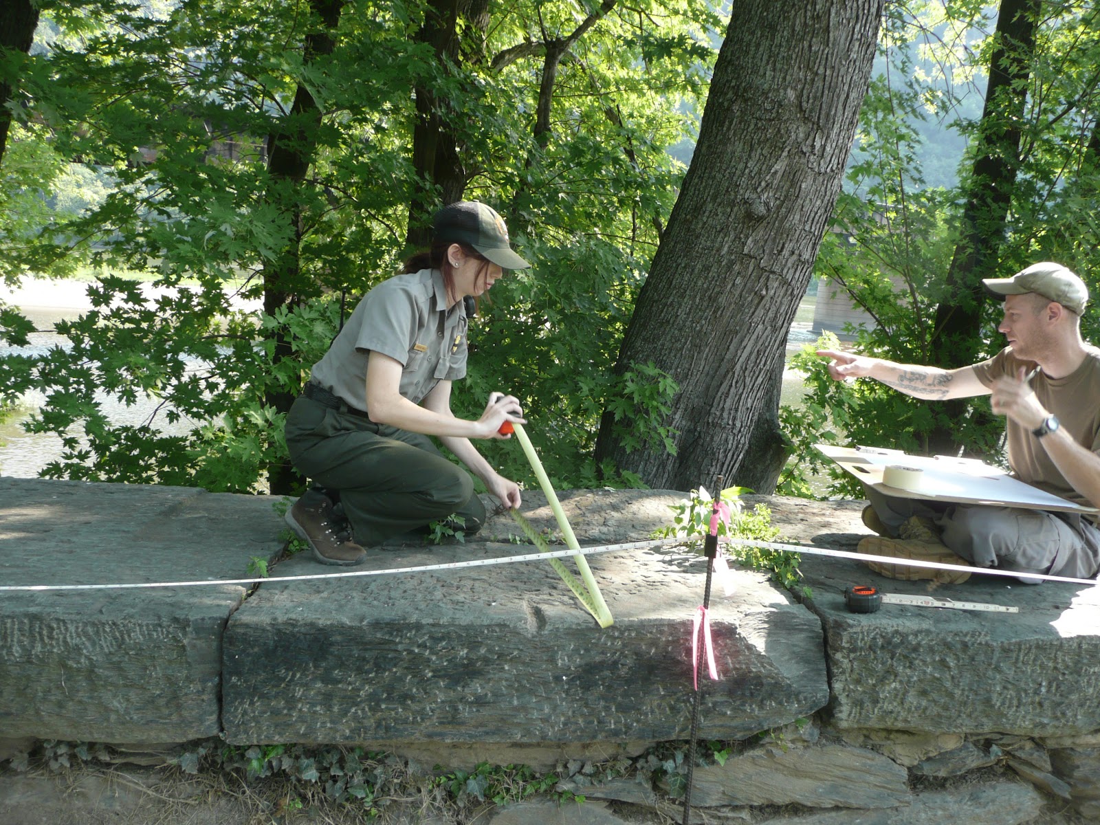 Wednesday we worked for the Archaeology Division. We were given the opportunity to help with a brand new project. This project was important because no one has yet to survey the water retention wall by the armory. This wall was also the place where the original railroad beams were located. We measured out the length and width of the top layer of the rocks and work out some calculations while Justin drew a map of the wall. In the afternoon, Jackie cataloged some interesting artifacts with Lori that was excavated from surrounding areas while I (Renee) continued to help Justin with his project. Overall it was a great experience.