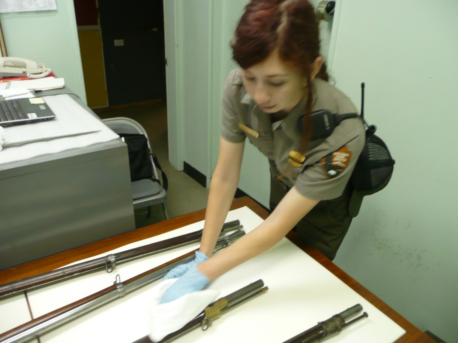 Later on in the afternoon, we went to a designated area that stored historic artifacts and cleaned some swords and guns (very exciting). We saw some antique paintings that we enjoyed very much so. Working for the museum division was a blast and we hope to have the opportunity to work with this division again during our second internship. We felt privileged to have the chance to work with such valuable pieces of our American heritage.