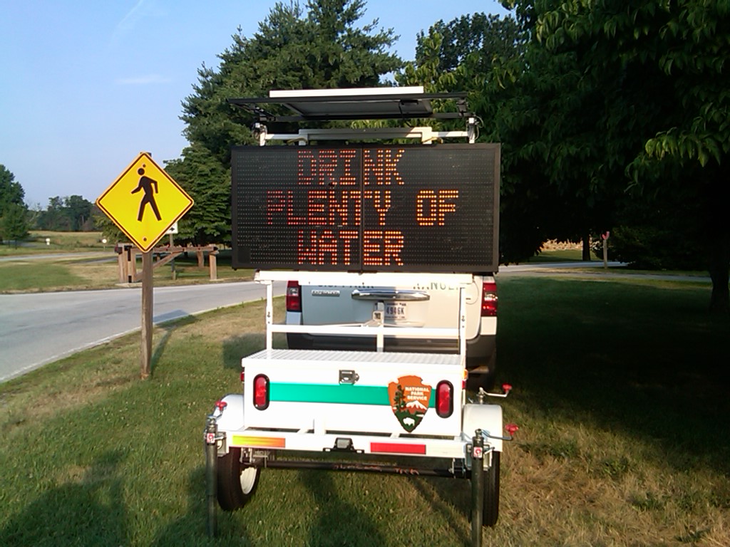 We also helped open the park on Saturday morning and were given the opprotunity to put up the sign trailer, the electronic sign that will give messages or warnings. Ranger Eric Hannah showed us how to properly set it up and scroll through the 40 different messages. We put it on an extreme heat warning, drink plenty of water message and this message locks after 5 minutes so no one can come up and mess with it. For now on we will be able to transport the trailer and set it up in various places throughout the park because the Rangers would like to get it out more often than they do. We also helped out the visitor center on Friday and Saturday due to the heat but we also did multiple driving patrols throughout the day to check not only on visitors but also on our staff. We gave out water to our staff members stationed outside at Mullenburg’s Brigade and Washington Headquarters and to visitors walking, running, or bicycling through the park to help prevent any heat exhaustion. Whenever we drive by any roadkill we clean it up to keep the park looking good and clean to visitors. This week we are heading to Natural Resources to work with juveniles from St. Gabe’s and we will be getting a couple night shifts and ride-alongs in the upcoming weeks. We’ll see everyone soon at Leadership Camp, hope everyone is ready!