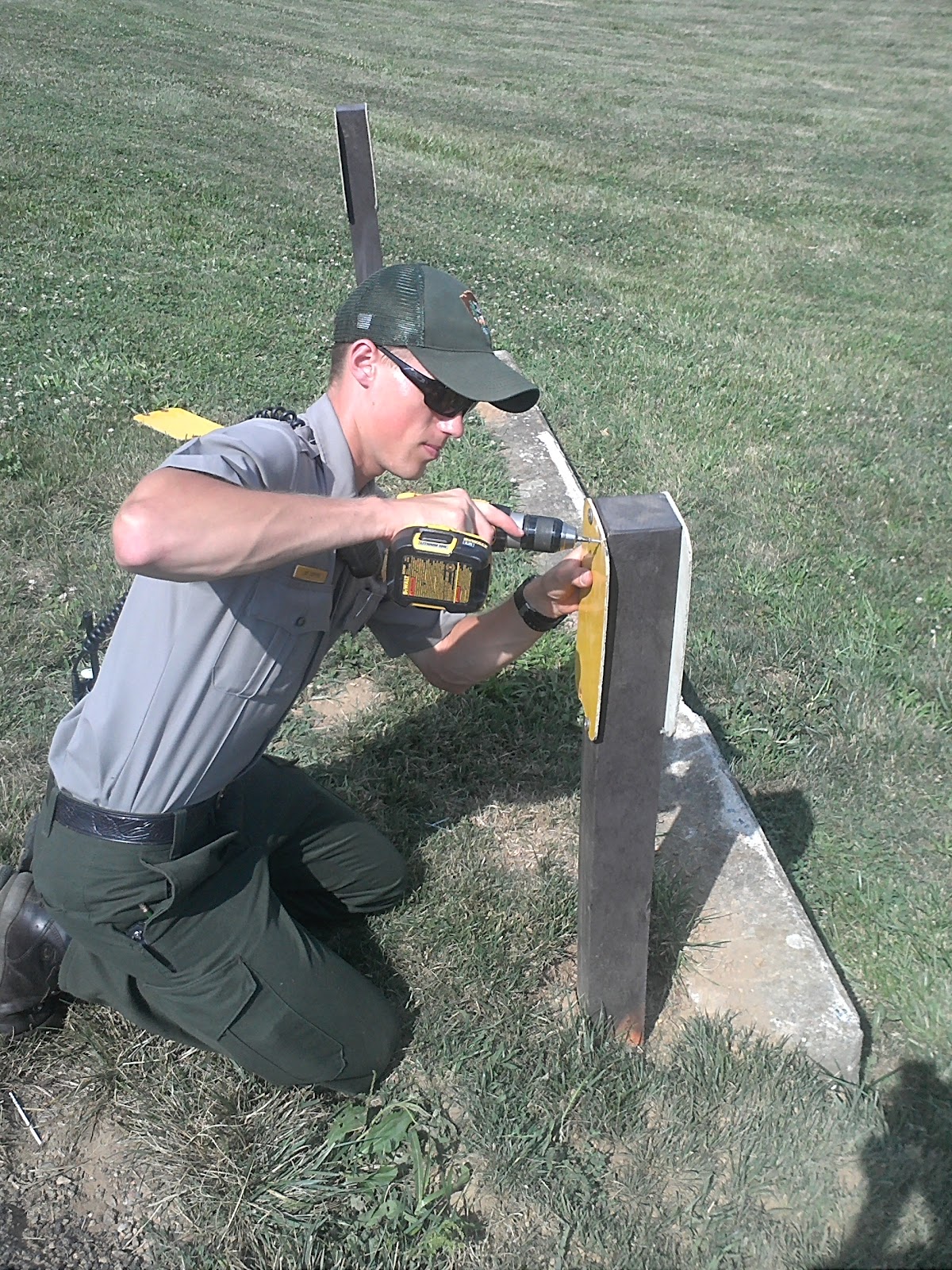 Thursday morning we began our day with a morning patrol of the battlefield. Next, Morgan and I put the finishing touches on our independent work project by washing the signs and installing additional reflective markers. In addition to our sign project, we also responded to a report of illegal dumping in the park. After an investigation, we determined that the waste products should be discarded properly. Ranger Jones and I returned to the dumping site and removed the items for proper disposal in the park recycling bins. Later, Morgan and I took the non-recyclable items to the maintenance yard to complete the clean-up process.