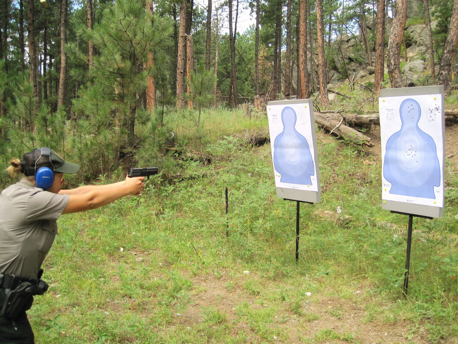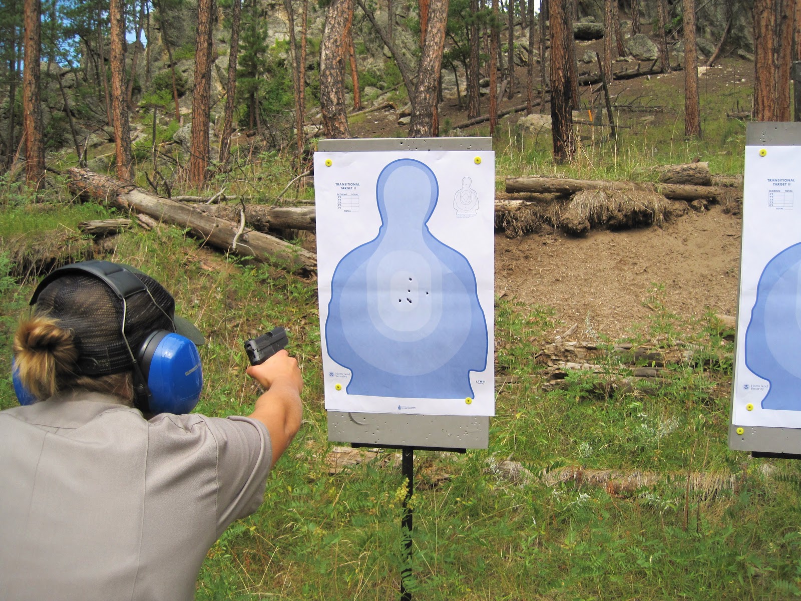 All Summer I had been working on the proper techniques for holding, handling, and holstering handguns and the day had come to put all those skills together.  Ranger and Firearms Instructor Darin Oestmann took me down to the park’s firing range to work with the handguns.  I first shot from the five yard line to get a feel for the weapon.  Ranger Oestmann also gave me tips for switching out the magazines and making sure to always practice proper techniques to build good habits and muscle memory.  He also told me the importance of being able to shoot one handed in both dominant and non-dominant hand in case one gets injured during a fire fight.  I feel much more confident when working with firearms and now have a better understanding of how they work and should be handled.