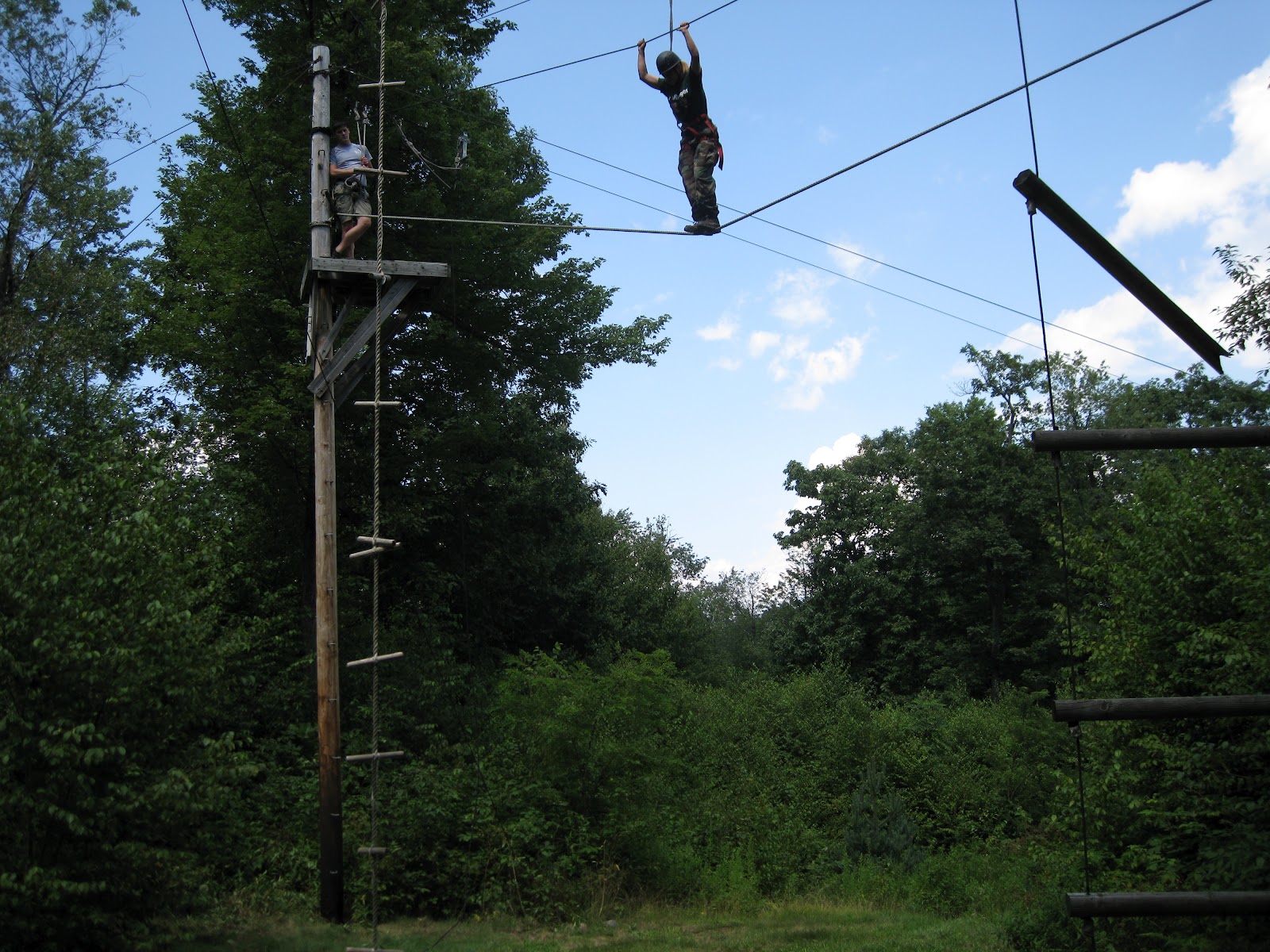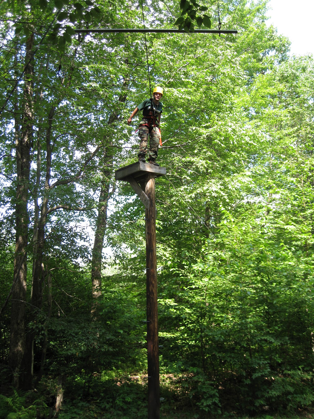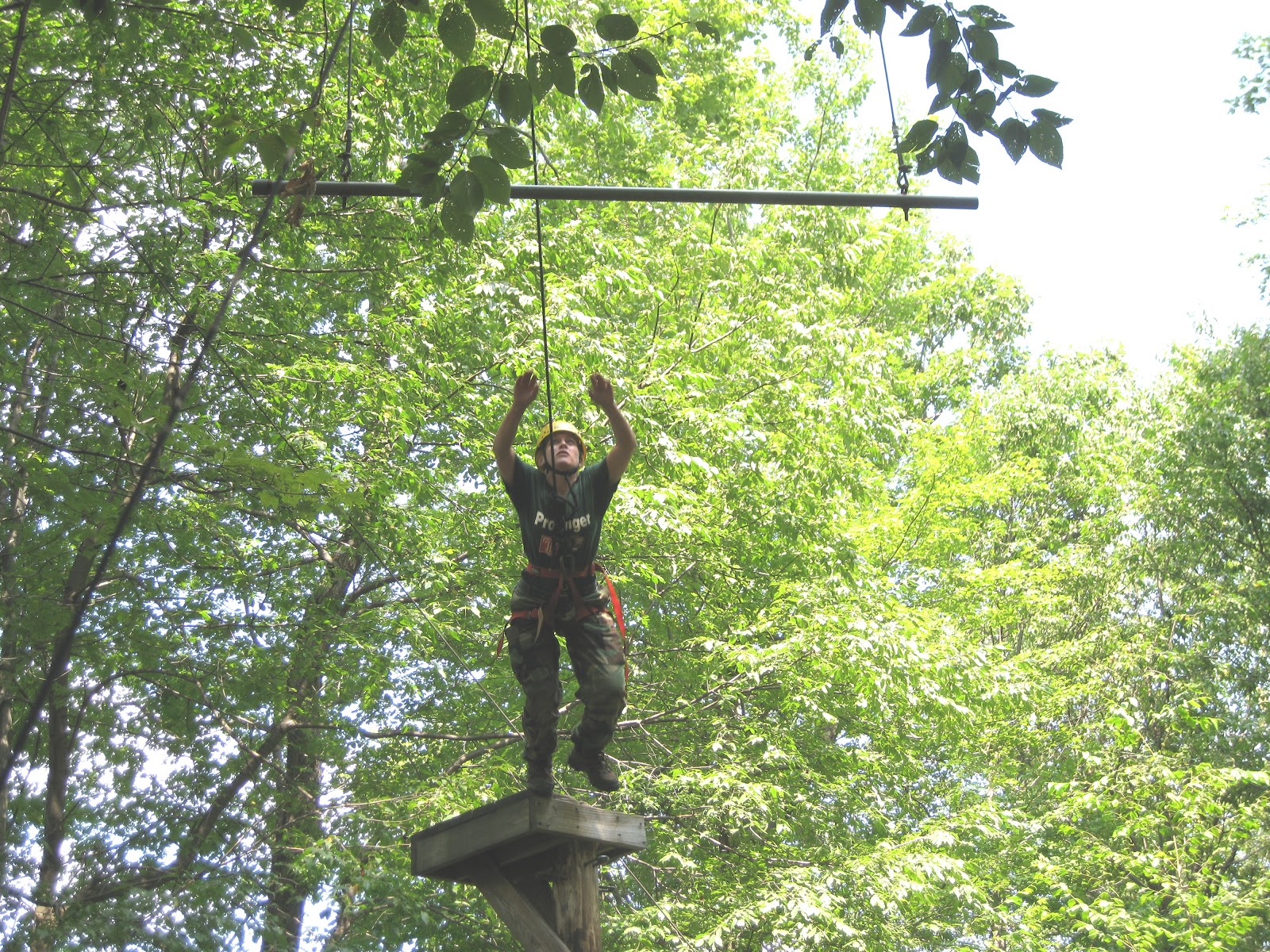 The following morning we awoke very early to conduct some PHYSICAL TRAINING.  I was already feeling the burn from the day prior because even though I think I am a fitness junkie, we were using muscles that have not been used before.  We ran in two lines and made our way to another ropes course.  This course was lines of ropes on an incline and we had to climb up and down the edge of a hill.  While some teams were navigating the course, other teams were doing jumping-jacks.  No matter what we were doing we had to stay moving to keep our heart rates up.  Later on in the day we went to the high-ropes course.  My stomach was turning with nervousness.  I have a fear of falling and this course gave me butterflies in my stomach and I could see I was not the only one who felt that way.  Anyway, I wanted to do this.  I had to overcome my fear.  Jeff was my partner and he gave me so much support.  I could not ask for a better partner.