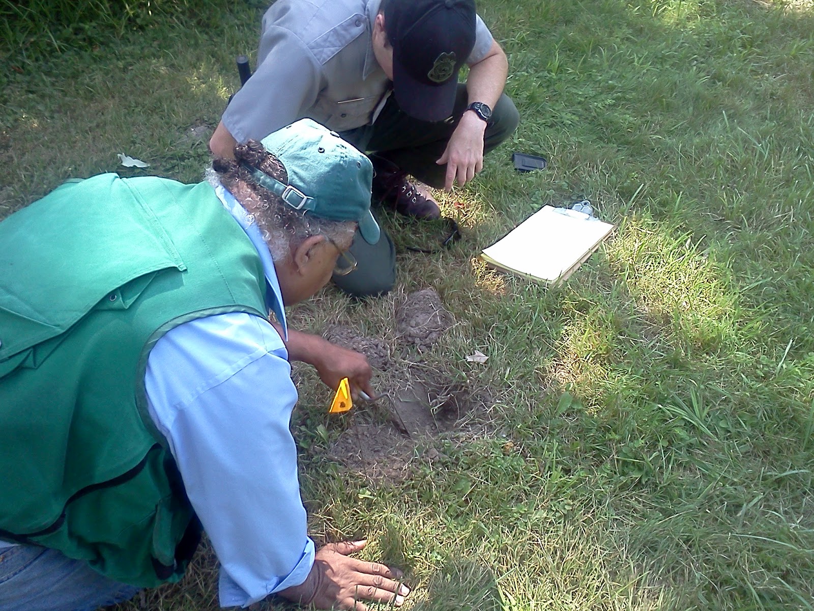 Around the same time that I was exploring Lost Avenue, the Law Enforcement Rangers discovered evidence of digging within the park near Culp’s Hill. Gettysburg is occasionally the target of souvenir hunters who cross the battlefield looking for war relics, such as bullets, buttons, and other items leftover from the battle. Chief Ranger for Law Enforcement Ryan Levins and I went out to mark the dozen spots where the relic-hunter was digging. Ranger Levins showed me how he set up the investigation, mapped the area of the dig, and notified Resource Management about it. Battlefield relics are a big business both in Gettysburg and across the United States, leading some people to scrounge for them on battlefields across the country. Not only does relic hunting damage the park’s grounds, but it also disrespects the park’s historical integrity and its role as a memorial to Civil War soldiers.
