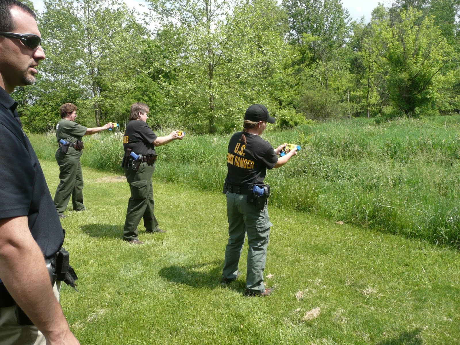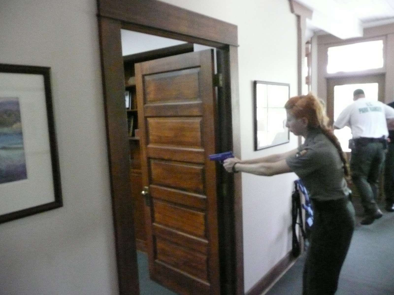 I started this week on Wednesday (my new Monday), May 29 with training with the LE rangers. They were doing Basic Tactics, Active Shooter, and their annual Taser Refresher. I was able to participate in the all day training learning things that were completely new to me. Basic Tactics was taught by Stell, the Defensive Tactics Instructor for the park. We went over proper ways for Officers to enter a building that has an intruder. I learned the proper procedure to make sure you are not putting yourself at any more risk than what is necessary, and to make sure you check your 6’s (6 o’clock, behind you), as it is easy to forget but very important. I learned the different techniques of how to enter a doorway or go around it and communicating with your fellow Officers what is cleared or needs to be cleared, and then I got to do drills with the other Rangers as we practiced clearing a hallway with our blue guns.