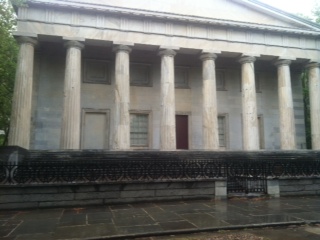 A Ranger and I completed building checks in Franklin court, which consists of historical buildings including Benjamin Franklin’s Post office. Today that post office is still a functioning United States post office. After clearing the area with dispatch, I was dropped off at the Ranger Station while a few other Rangers responded to an intrusion alarm. While they did that I spoke with my supervisor about the different types of alarms at INDE. He told me that an intrusion alarm rings when there is motion detected in a closed and secured building. Here at INDE there are also water censored alarms as well as fire alarms. These two alarms are very important because there are so many old and irreplaceable buildings and property in this park, that in order to preserve and protect everything these alarm systems are necessary. Once the Rangers cleared the Building they reported back to the station and informed everyone that nothing or no one was found. It was a false alarm. I went back to clearing park property and started at the Pemberton complex and checked to make sure the doors were locked. We cleared the inside and out then moved on to 2nd bank. Second bank is a very important building here because not only was it the 2ndestablished bank in the United States but currently it houses very important artwork of the nations original leaders like Mr. Stephen Decatur known for his naval victories in the early 19th century. I snapped a few pictures for the blog and we closed and locked the back exit of the building. Also I want to inform my readers about how well the park is structure to accommodate persons with disabilities. 2nd bank has a separate entrance for people with disabilities and it is decorated very nicely to entertain them. 2nd bank has a ramp and elevators to assist; the accommodations in this building are well designed.