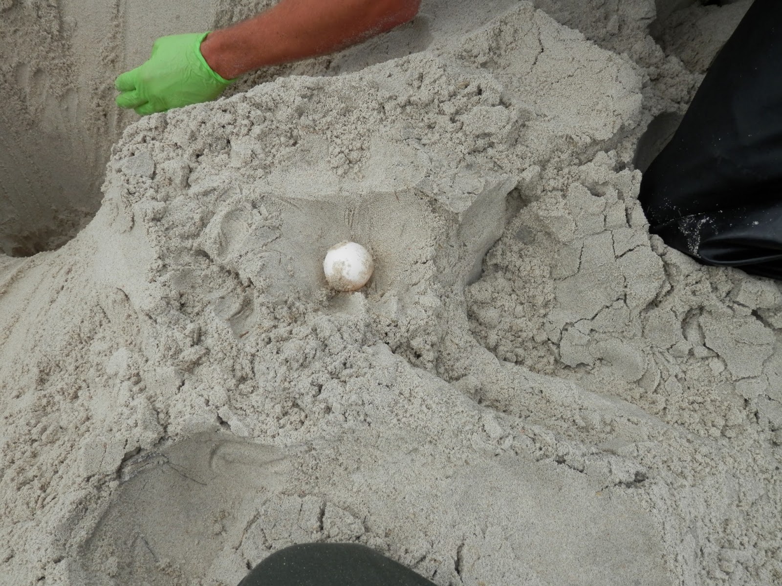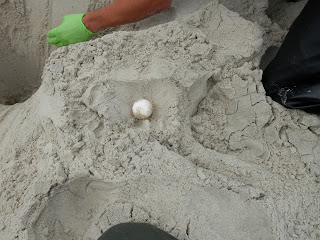 Later in the week, my supervisor and I had a more positive experience with a turtle nest enclosure. While on patrol, we found one of the Bio-Techs tending to a new turtle nest on the beach. The nest had been created the during the night, and the turtle tracks were still visible. Ranger Krebs and I assisted the Bio-Tech in setting up the nest enclosure, and searching the nest for the eggs. When a nest is discovered, the Bio-Techs must hand-dig through the sand in order to locate the eggs and inspect them. The depth of the nests vary, with this one being approximately 8 inches below the surface. This was the first time that I have actually seen the fresh turtle tracks leading up to an enclosure, and it was also my first opportunity to search for the turtle eggs. In the future, I will be spending more time with the Natural Resources Division, and hopefully seeing more nests and turtle activity.