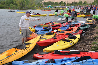 | Volunteers in the green received the boats as the participants got off to cross the finish line. These volunteers moved the boats onto shore where their owners could later pick them back up. |