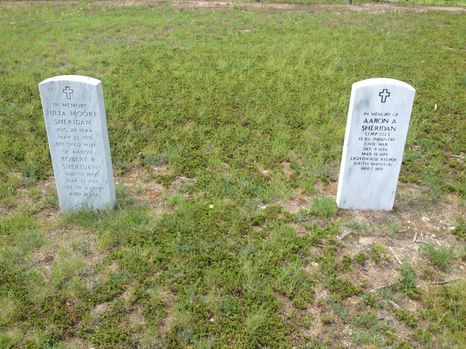A little lighthouse history. These are grave markers for Aaron and Julia Sheridan. Aaron was the first lighthouse keeper of the tower on South Manitou. Him, his wife, and their youngest baby tragically drowned in Lake Michigan when they got caught in a storm through the Manitou Passage, and their bodies were never recovered. I tell a ghost story relating to the Sheridans on my tour.