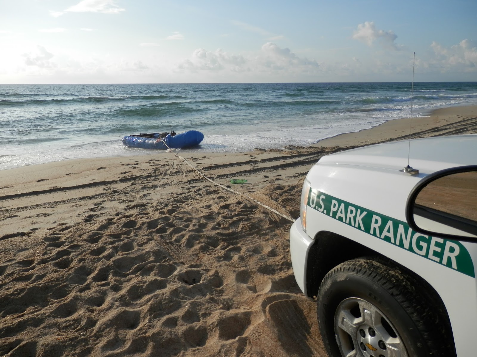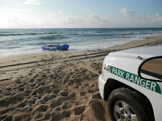 Thursday, I was again assigned to the morning shift. As we started the shift, we headed out to the nearest ramp to check for night driving violations. Instead of finding vehicles on the beach, we found a much more interesting surprise, a homemade raft. Upon finding the raft, we immediately called the local Coast Guard Station to find out if they had any rescues in the area, or if they were aware of a stranded raft. As we were waiting to hear back from the Coast Guard, we cordoned off the area and attached a tow rope to the raft in order to keep it on the beach. During this time we also investigated the various items that washed ashore with the raft, and spoke to visitors who discovered the incident.