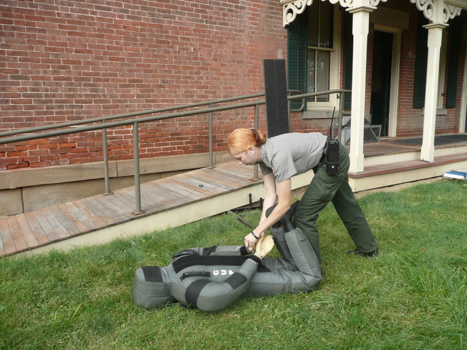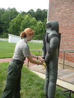 When I was back with Ranger Stell, he went over handcuffs with me. We talked about how to load them up in your carrier, and taking them out so they are positioned in the most efficient way. I got to work on them and get a feel for them and locking them. Then a good friend of the Rangers- Handcuff Man came out to help. I got a chance to learn about the handcuffing techniques from standing, kneeling, and prone. Depended on which position the person you are handcuffing is in, you want to be in your best spot to remain in control. Body position and movement and placement are very important and I got to go through the motions so I have a basic idea on how it is done. I learned other important concepts like keeping a distance away from the person until ready with the handcuffs, the bigger the threat the lower they go on the ground, and more. It was a great basic lesson and very important because I will need this for my career.
