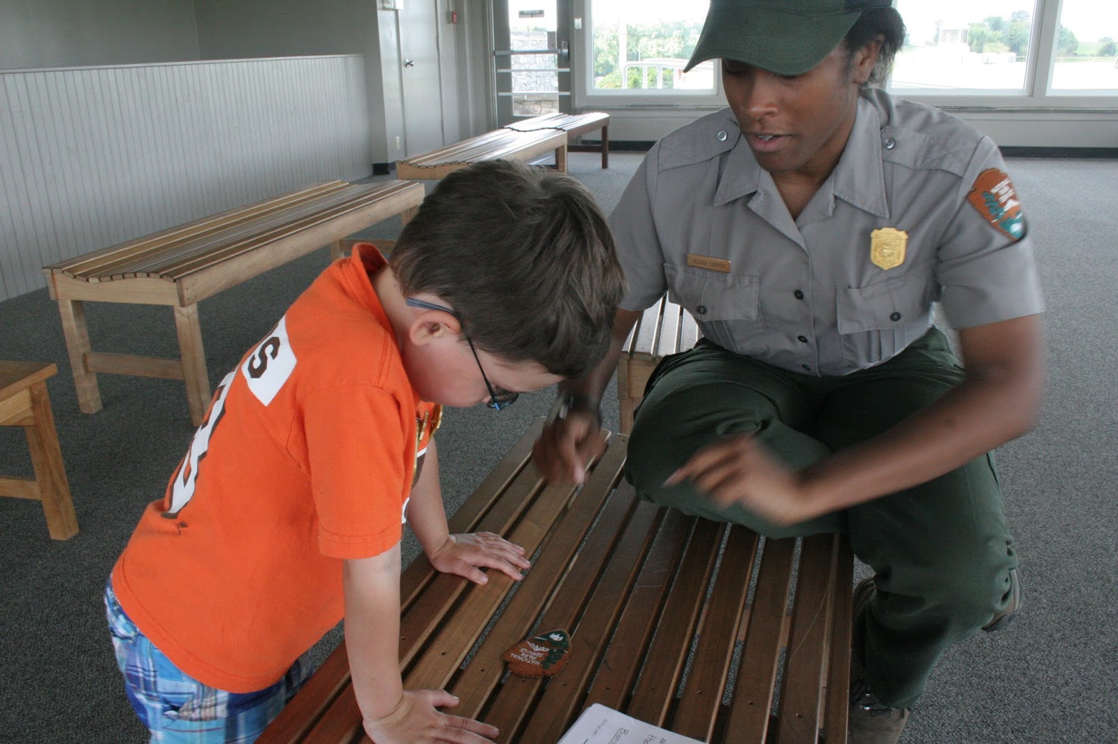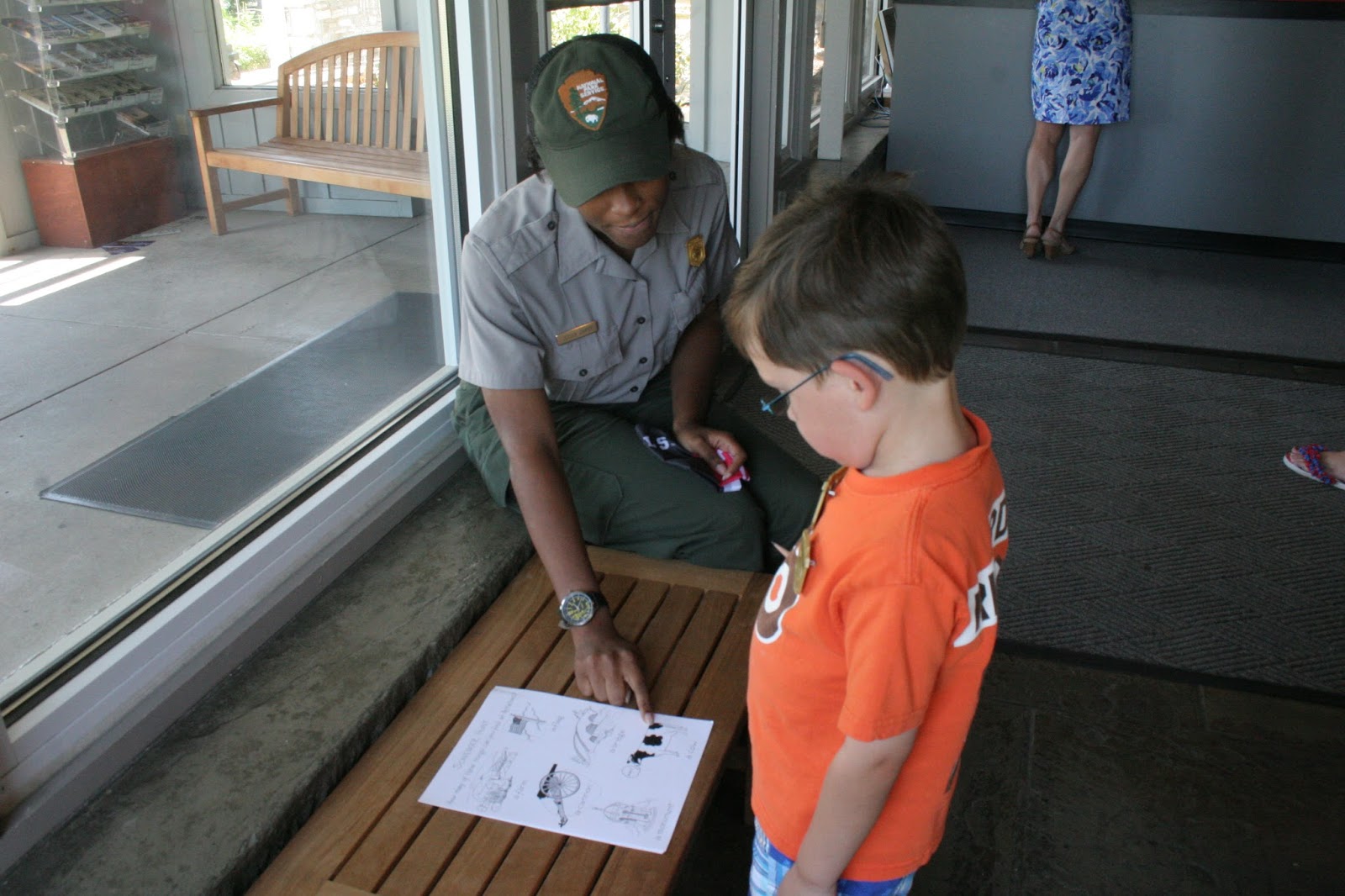 We met ProRanger Jess Cooper and Ranger Tom Jones outside the Visitor’s Center.  Then, Jess started our tour of the park with the most important things:  getting a copy of the junior ranger book and getting our passport stamped!
