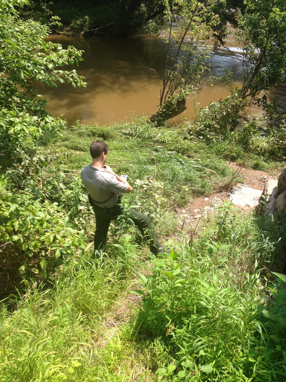 I had the privilege of going along with Officers Travis Baker and Jim Hans as they gave me a good look into how the Law Enforcement Division operates at Monocacy National Battlefield. The pictures above are from when I was on duty with Travis. On the left, he was using binoculars to see past the tree line. On the right, Travis was communicating with the dispatch center to check on an individual’s fishing license status. It just so happened that this lead to an arrest.