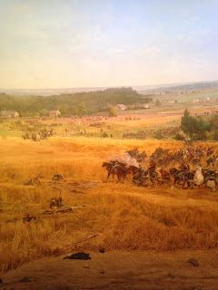 The room the Cyclorama is in features dimmed lights, narrative voices to depict what is in front of visitors, and sound/light effects (for the big bad cannons). During the late 1800s, the Cyclorama style of painting was very popular in the U.S. and Europe. However they lost popularity with the rising of motion pictures which we use today in modern society. None the less, it is still very cool to see these type of paintings.