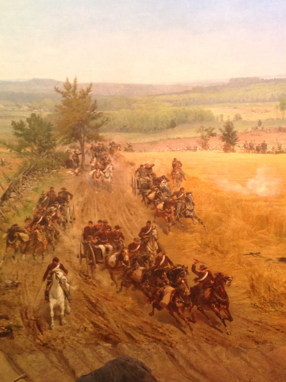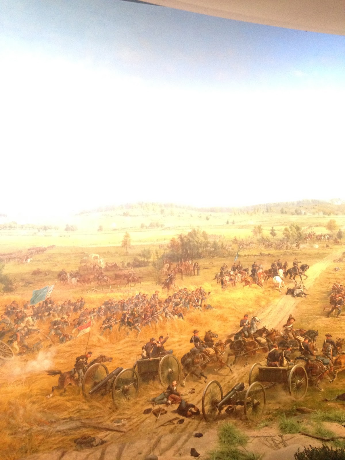 However, aside from free parking at Gettysburg we have this very cool attraction that depicts the third day during the Battle of Gettysburg. We call this feature the Cyclorama painting. This is a 360 degree canvas oil painting that surrounds the room it is placed in. It looks like the painting is 3D the way the illustrations pop out at you but, you can’t touch it. I tried.