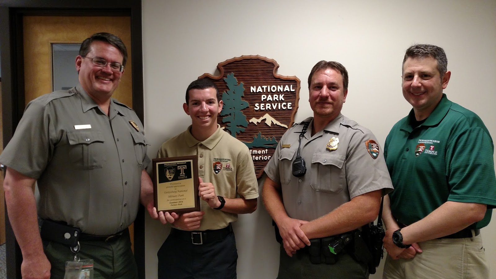 Hello All. Hope everyone is having as much fun this summer as I am here at GETT. This past week started off with a visit from one of our instructors Mr. Anthony Luongo. When Mr. Luongo arrived Monday morning, the first thing that I thought would be fitting to show him was our film and cyclorama, which shows and illustrates the civil war, and what happened here at Gettysburg. After we were done the film, we had a meeting with the Superintendent of Gettysburg, Superintendent Ed Clark, as well as with my Chief Ranger Jeremy Murphy. During this meeting, we discussed my progression so far this summer, and how the program itself has grown over the years, and if there is any way we could get more involved during the school year at local national parks, which I feel went very well and am excited to see where it goes in the future. During the meeting, we also presented both Superintendent Clark and Chief Murphy with a ProRanger challenge coin, polo shirt, and a few other goodies. We also presented to them, with thanks from another one of our instructors, Mrs. McGarvey, plaques for being participating parks, including one from this year. At the conclusion of the meeting, we all got a picture together in front of the arrowhead with the plaque, with smile to go around. Just think it wasn’t even lunch yet and we were having a tremendous day!