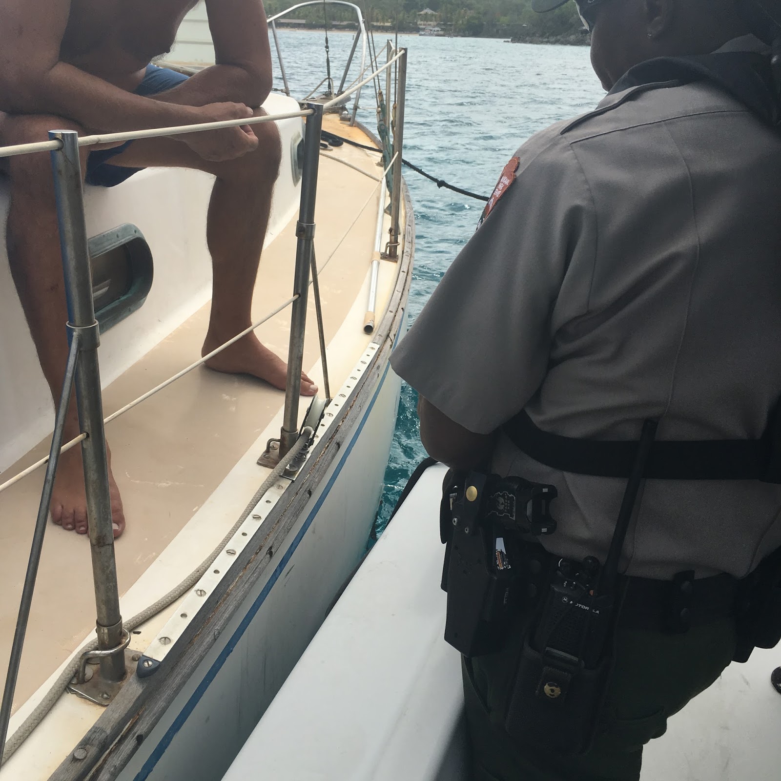 On Monday night LE actually got an interesting call. At Honeymoon beach, my chief ranger got called out for a sailboat vessel that washed up, Turns out that the boat’s line tied to the mooring somehow got loose from the mooring itself while the captain was sleep. When it washed on Honeymoon, my chief Rick, made first contact with the individual. The next morning, I returned with my supervisor, Ranger Smith, and we went out to Honeymoon to do a small investigation to get some information from the individual.