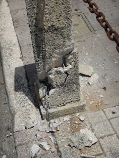 We had an interesting little encounter today. In the morning we discovered that one pillar that supports the chain gate to the San Sebastian Bastion had been hit by some motor vehicle.