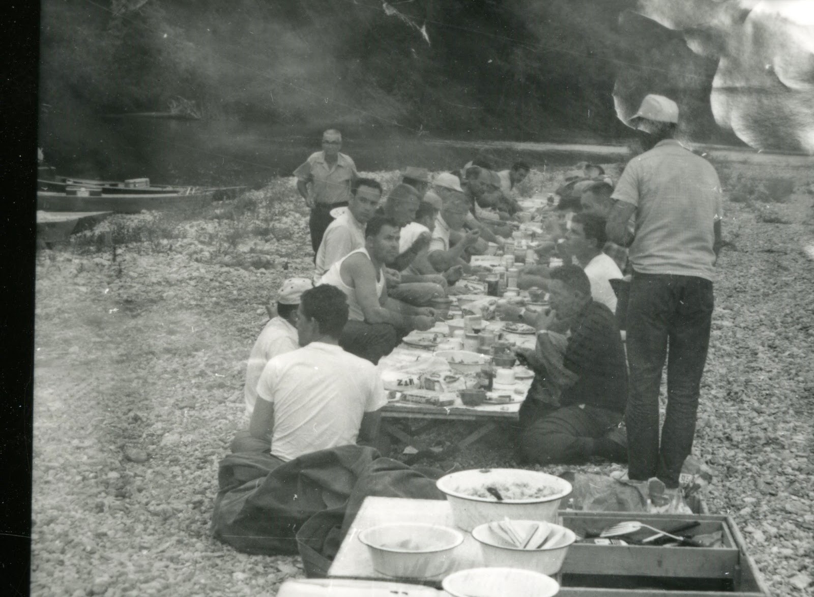 But before the delegation of the Riverways, floating the current river was a much more of an elite ordeal. When the park was a state park in the late 1920s, concessionaires started to emerge to offer guided floating trips. Walter Bales began to offer “deluxe float trips,” a service provided out of his store in Eminence, MO. Soon, he expanded his business into Bales Boating and Mercantile Company, which targeted an elite market of wealthy businessmen and politicians. Bales’s fleet consisted of twelve johnboats, a store of camping gear, and a crew of river guides to conduct these trips. When a trip went on the river, a mercantile boat floated ahead of the guests, stopping at the floaters end point for the day to set up camp, which included beds and cots and prepare meals before the floaters made it down river.