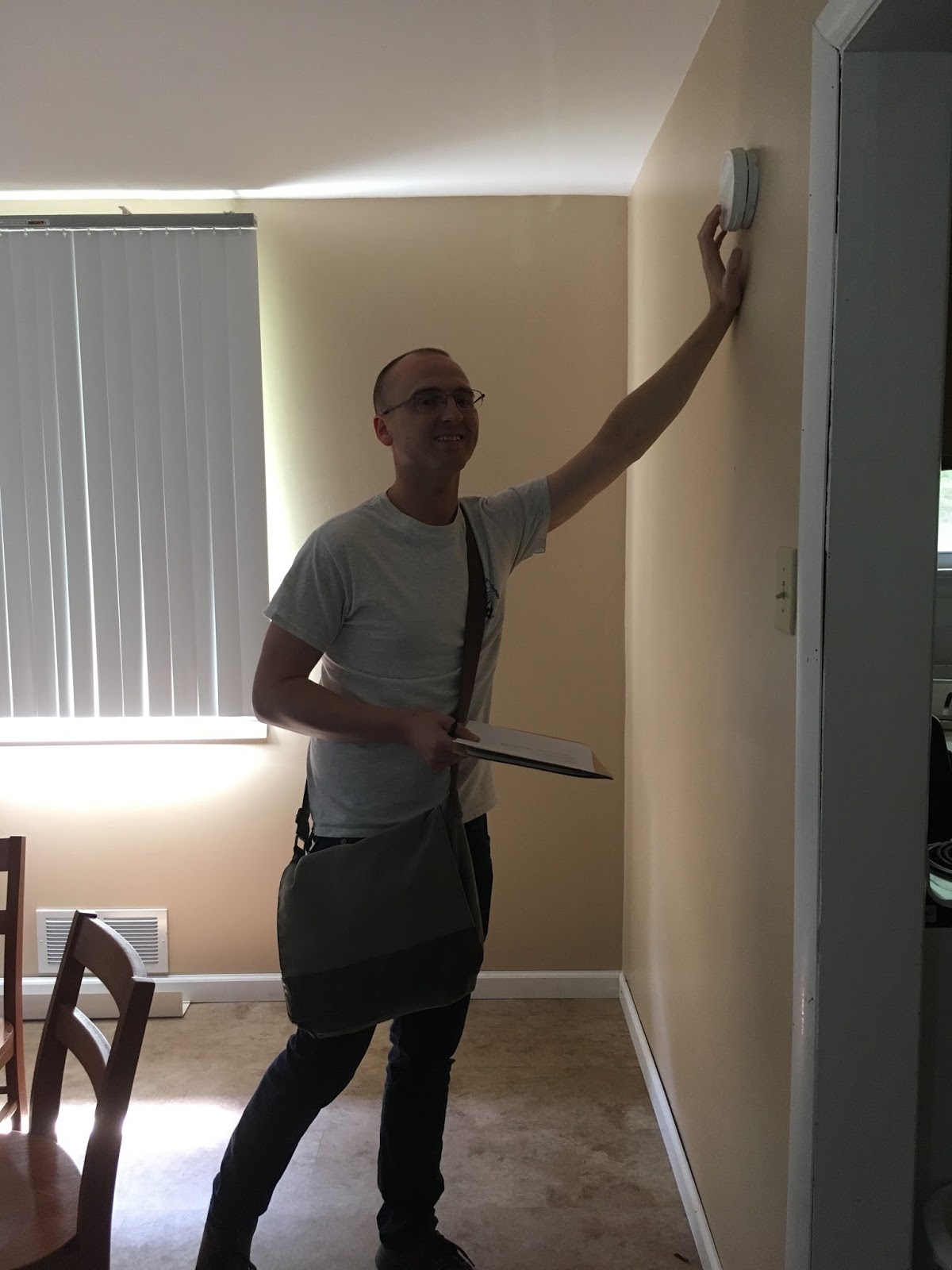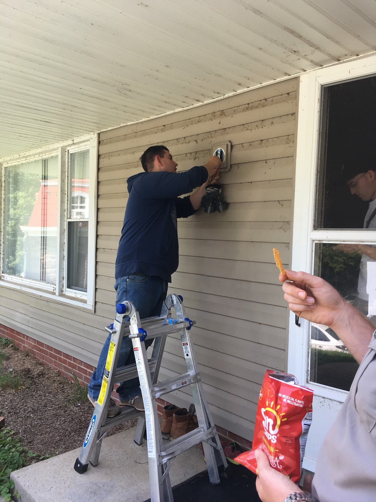 On Thursday I was at Great Falls Tavern with Chad and John, taking care of some property stuff and getting an introduction to the IT features of the park.  While John is the park’s IT specialist, he also doubles as quite the handyman.  Here you can see him installing some floodlights with motion sensors.  Chad made the rounds in this park housing building, checking out the smoke detectors and whatever else he has there on that clipboard of his.