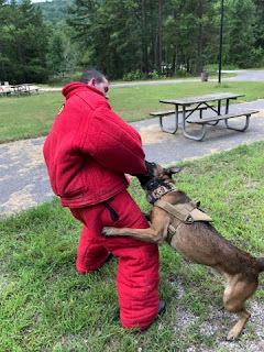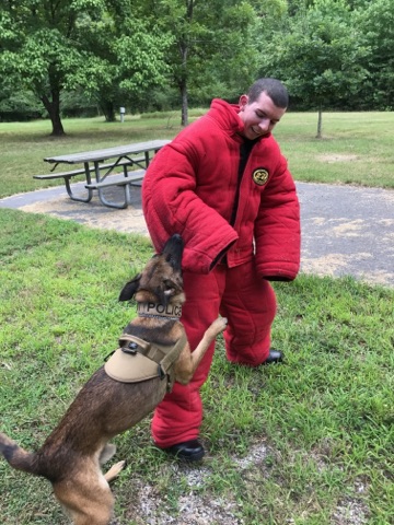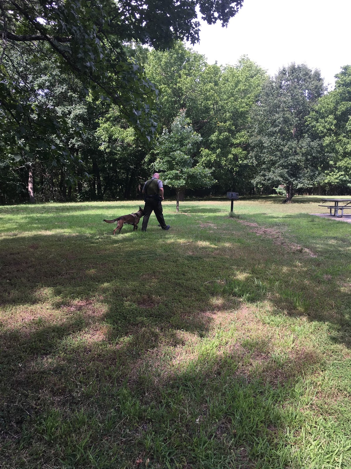 This last week of work couldn’t have started out any more perfect, as I was able to get into a K9 training bite suit and help in training Canine Konyak with Ranger Little. This would be my first time in a bite suit and be getting bit, and you think I would be nervous, but I had no nerves just plenty of excitement. On our way to the spot we used for training, Ranger Little was explaining the many different scenarios that can occur that would require a bite or release of a K9 on a call. He also explained to me the importance of training and how he needs to record it after every training day so that if asked for it in court due to the use of K9 Konyak, he has the records to prove that Konyak is a highly trained and successful canine. Every week on Wednesday Ranger Little and Konyak train in the morning for a few hours with Hot Springs Police Departments K9 teams, which they have 6 of. The combined training is beneficial first off because it allows for all the units to know each other and what each canine can do if they need to work together. It also is beneficial because it helps form a closer working relationship with Hot Springs PD who we interact with and help a lot.