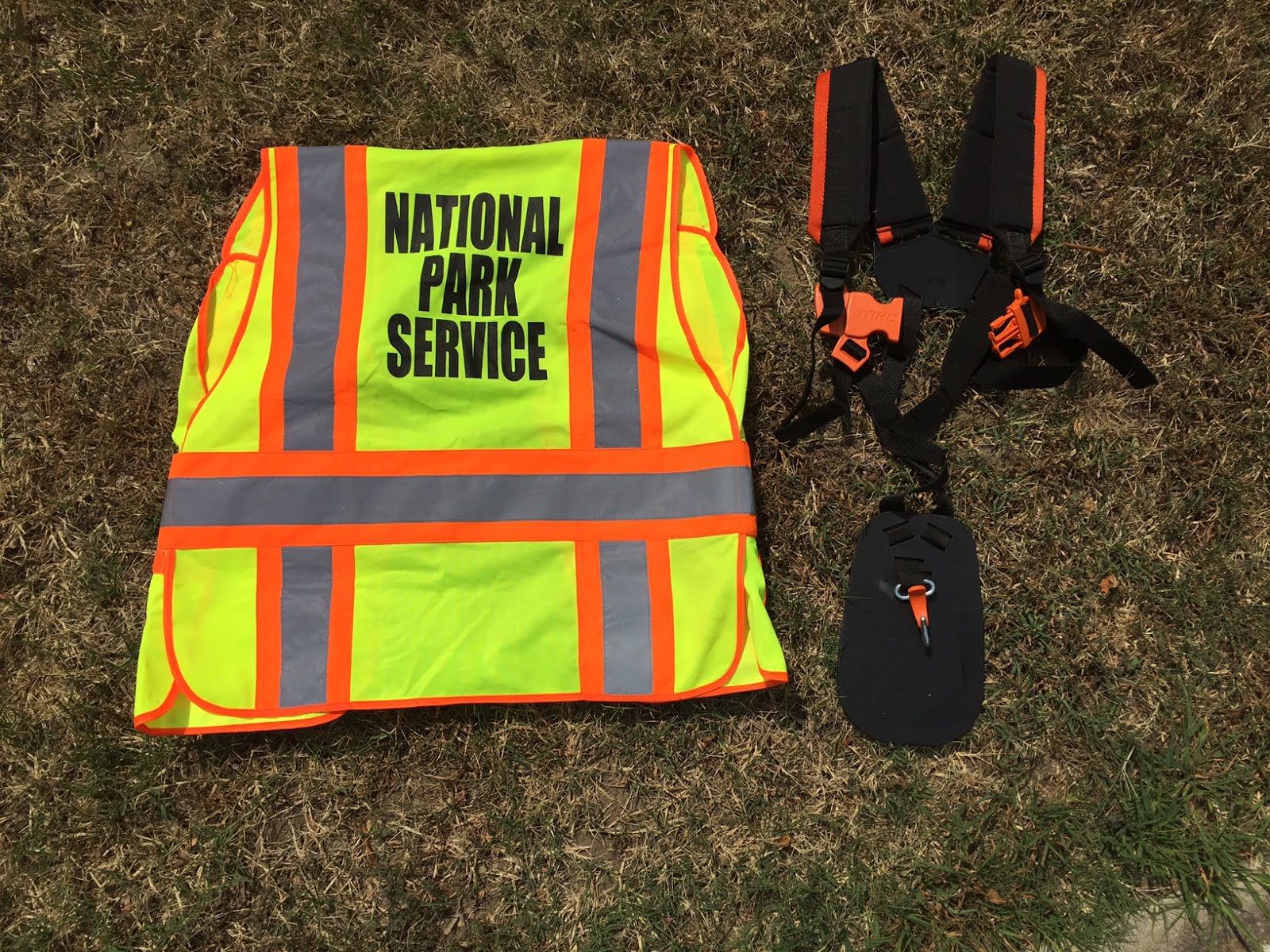 The project that gained the most notoriety over the years however, always appears to be saved for ProRanger week. Being that I’ve been working so hands-on over the weeks, I was glad I could get my hands dirty on this project. Jones Mill Pond is an area along the Parkway that visitors can park and view the pond in an effort to better understand the landscape around Yorktown during the American Revolution and Civil War. This area around the pond however, can grow rampant with invasive plants and can overgrow into areas where visitors have access. We used a tractor with a “long-arm” on it (almost like a mower that extends quite far) to clear the way around the pond in addition to the number of weed-whackers (pictured) for every maintenance worker on the ground. As you can see in the photo with the vest that I wore, I would clip the weed-whacker to the harness so that it could rest on my hip during the hours that I used it instead of having to hold it over the course of the workday.