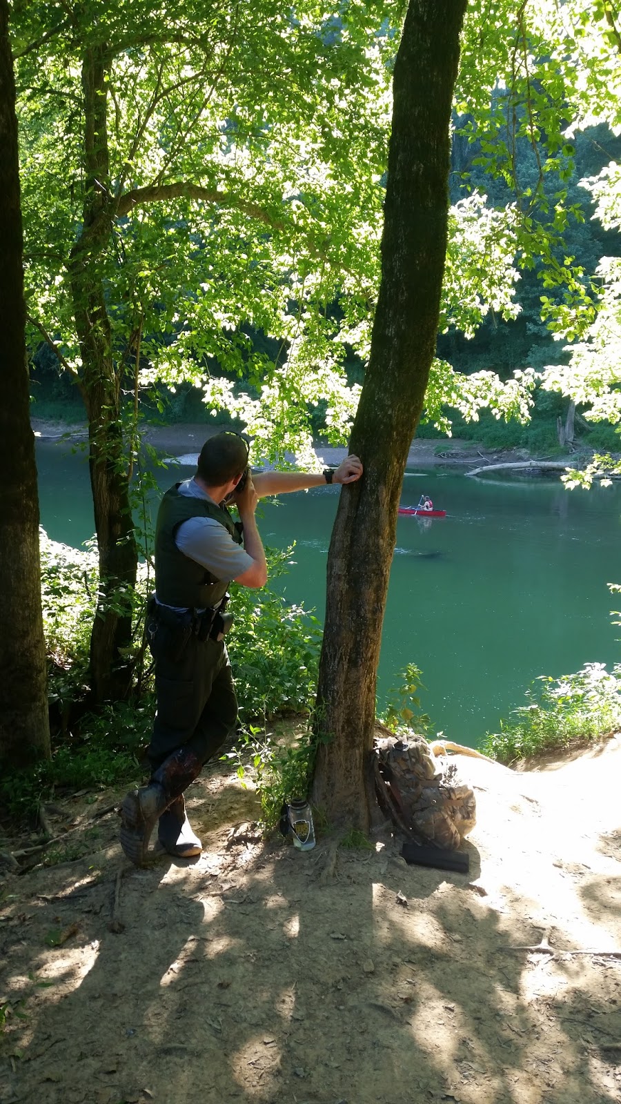 Mammoth Cave operates with two officers on river patrol to increase officer safety. A reason for that is because most parties we have contacted are clustered between two and five canoes or kayaks. The average number of people in those contacts were between three and eight people. When you have that many people involved in a contact and no clean route to or away from them, it could make for some complications. The Green River bank is pretty steep, especially with the dropping water levels seen this season. I was responsible for carrying our pack up and down the slope. If there was further reason to investigate, my duty sometimes rolled over into securing an evidence bag, producing a ticket book, and delivering a breathalyzer to the ranger conducting SFSTs. I also conducted some surveillance by standing in cover and looking through binoculars for violations or reason to contact visitors.