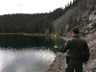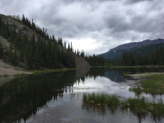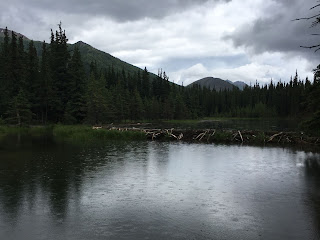 I did a foot patrol with Ranger Shore of the Horseshoe Lake Trail (much of which runs along various shores), which was also my first opportunity to get to that part of the park. We were looking for some belongings that had been dropped by a woman who was fleeing from a charging moose in the past week or two. We did not find her things, but it was a nice walk. I got to see the work of some busy beavers, the rain mostly held out for us, and we were not charged by any moose.