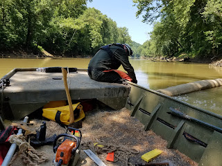 | Ranger Russell using his chainsaw on the river. Not pictured: me getting sprayed with water and wood chips. |