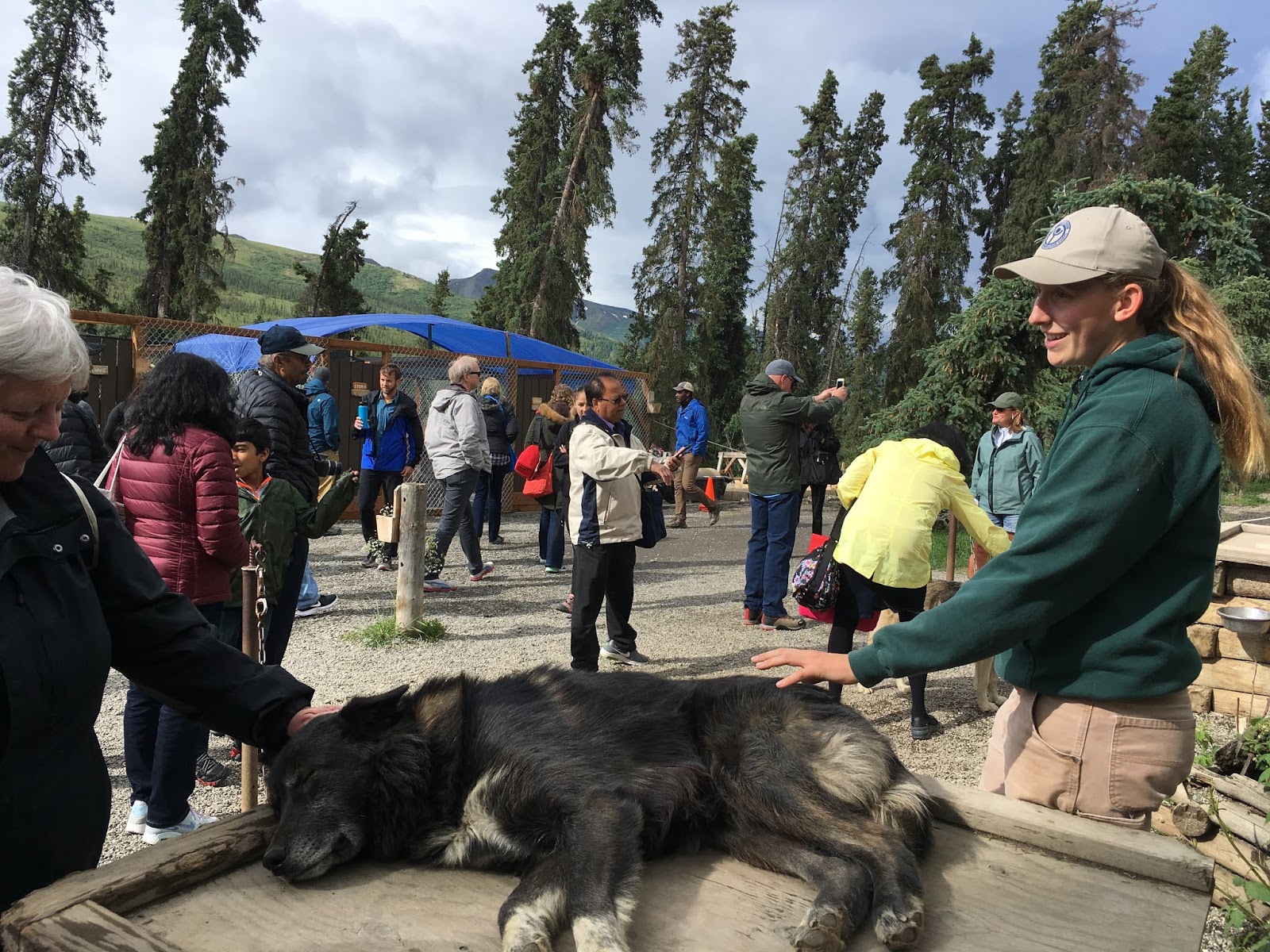 We checked out the rest of Headquarters and C-camp. We poked around the Shaffer building, saying hello to Ranger Dave Stack, as well as the Shaffer annex, and maintenance yard. We headed out to the Savage River area and talked to the folks in the Savage box. We hiked the loop trail, as well as climbed up to the rock outcropping that begins the Savage Alpine trail. It was a busy day. In the evening Meaghan joined us and we went to eat at 49th State, where I ate with Meaghan when I first arrived.On Tuesday, I put Vicki and Adrian on a bus, since we already had a pretty exhaustive tour of the front country, minus a couple of trails, and they were here for three days. I explained to them their options, taking the different tours or transit buses of varying length journeys. They chose to take the transit bus out to Kantishna, the end of the road. This is a twelve hour round trip journey, and Ranger Fernandez didn’t let anyone forget that particular detail afterwards. But if he tries to say anything to you about it, remember that it was their choice; I didn’t tell them which bus to take. And also look at this photo showing how happy they both were.