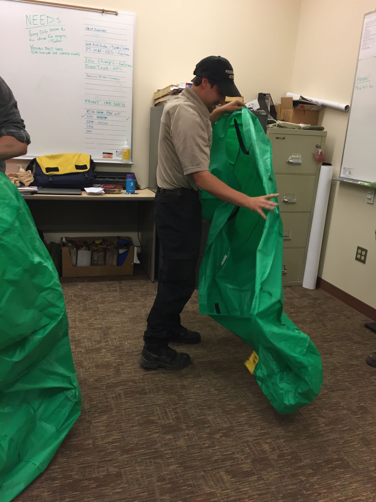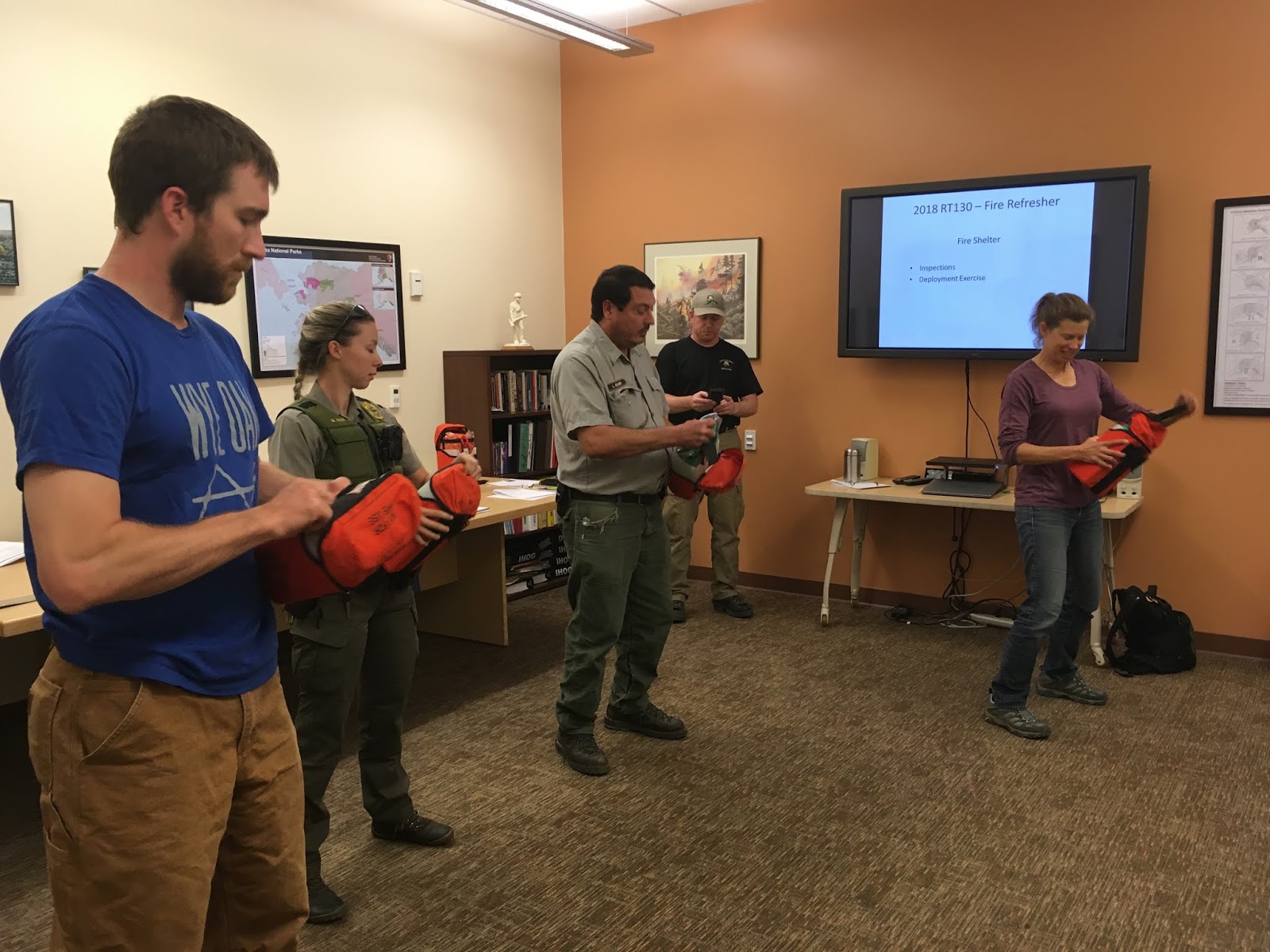 In the afternoon, I sat in on a fire refresher with several of the rangers and other park employees. This included an overview of the 2017 firefighting season, expectations for the current season, a discussion of margins (as in creating greater safety margins by mitigating risks, having backup plans, etc.), an in depth look at the Nuttall fire (in which backup plans were quickly eroded by unexpected fire behavior, injury, and poor communication), and a fire shelter deployment test. We had 25 seconds to open the packaged up shelters, shake them out, get inside them, and get on the ground with the edges sealed and as much air as possible inside. Pictured below are practice shelters.