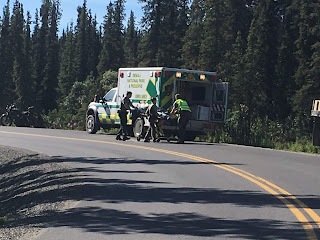 On the way back east we drove onto the scene of a motorcycle accident. There were two vehicles stopped in the road, with the drivers moving the motorcycle off of the road, after appearing to have already helped the driver, the only one involved in the accident. At first, the driver appeared completely fine, as he was sitting up and talking. After coming over to talk to him we could see that he was probably injured. Ranger Page called for assistance and began conducting a medical assessment while I wrote down the information. She determined that he probably had a broken collarbone. He described going over the handlebars, luckily, he was wearing a helmet. Medic one (the ambulance) arrived along with several other rangers. I began directing traffic along with several maintenance employees who stopped to help while the rangers finished the assessment and loaded the man into the ambulance. He remained in good spirits throughout and we drove him to the clinic.