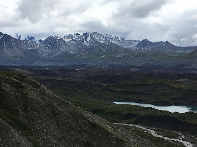 | Looking northwest towards Kantishna and the two of the Muldrow, covered in sediment and plants |