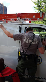 On the 5th I was debriefed on the craziness that happened during the night shift on the 4th. There were a few wild fights and light posts down but nothing that isn’t expected on one of the country’s drunkest days of the year.  Rangers are responsible for supervising any set-up and break-down of stages around INDE, especially if it involves any traffic interference.  So while observing the break-down in front of the Hall, Ranger Keiffer was called to help one of the workmen ‘break’ into his car.
