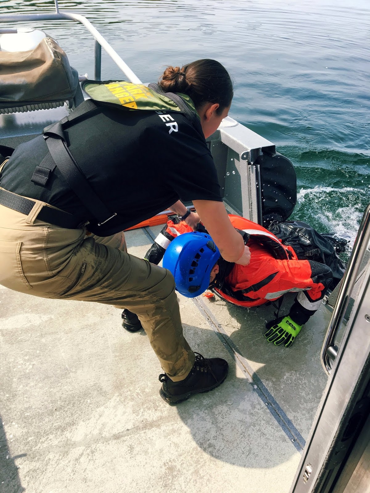With Chief Hughes as captain of the Arrowhead, he and I started practicing “man overboard” protocol under the supervision of Ranger Paupore. To simulate a person going overboard, Ranger Paupore would throw a life ring off the boat and then signal to begin the drill. With Chief Hughes at the helm and some pretty great line bag skills from me, our fastest rescue time was close to 2 minutes!