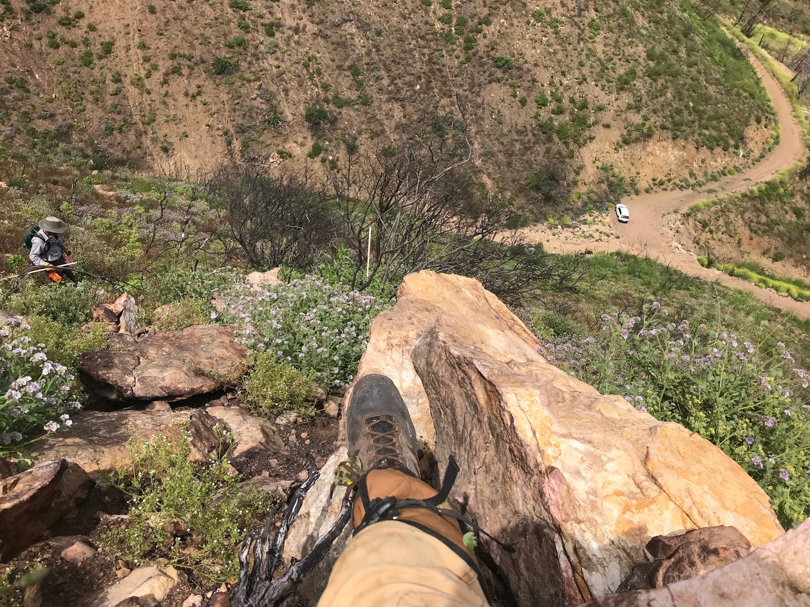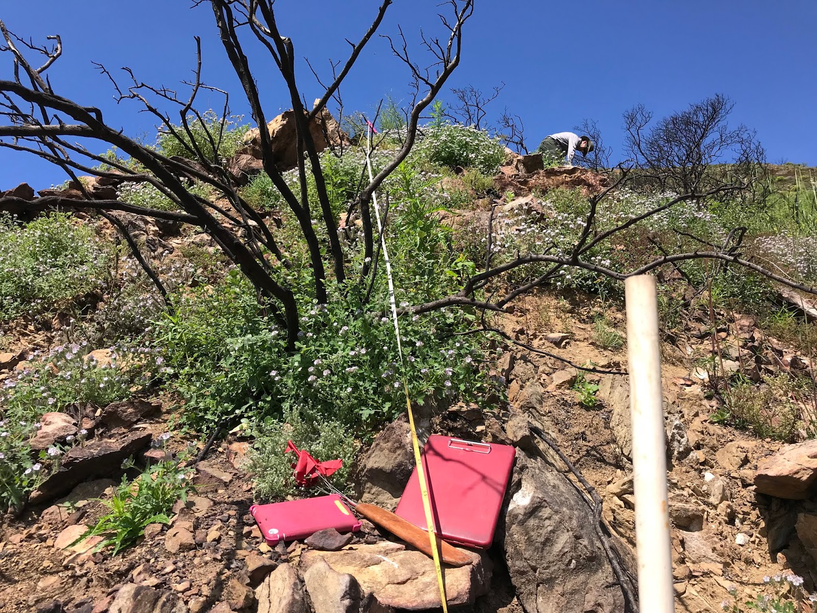 The first day I worked with a man named Mark. He looks at the vegetation in plotted areas to look at the health. This is especially important after last years devastating fire to see how the ecosystem will end up recovering. Mark explained to me that for vegetation they randomly pick a plot of land that is 30 meters by 10 meters and check it annually. This particular plot of land that was picked was on the side of a mountain that we had to hike up. This hike was only about 100 meters up but it was literally at almost a 45 degree angle which was such a blast to hike up (If my dad is reading this: picture walking up Challenger at Blue Mountain!). So once we got up there we roped off the plot of land that we were looking at and begun. What he looks for when he checks the plots of land is native species. So he would dissect each part of the land counting the plants, seedlings, dead plants, etc. Mark is a genius and can identify almost every plant by its genes name even if it is just a seedling. It was fascinating to watch. What I did while he was doing this was plug in all of the data he was yelling out.