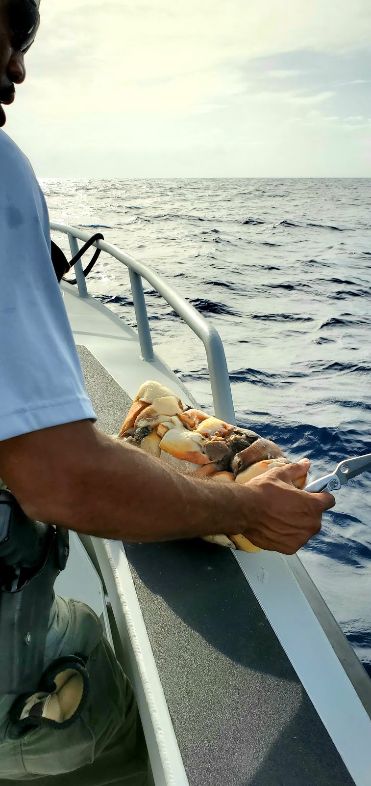 After loading the seized conch into the back of the patrol vehicle, we made our way to the marina in order to transfer the evidence onto the law enforcement vessel for disposal in the sea. To properly dispose of the evidence, we traveled over three miles away from St. Croix to ensure the conch wouldn’t wash up on shore. Once we were far enough away from the island, Ranger Laurencin, Ranger Clarke, and I prepared to dispose of the evidence.