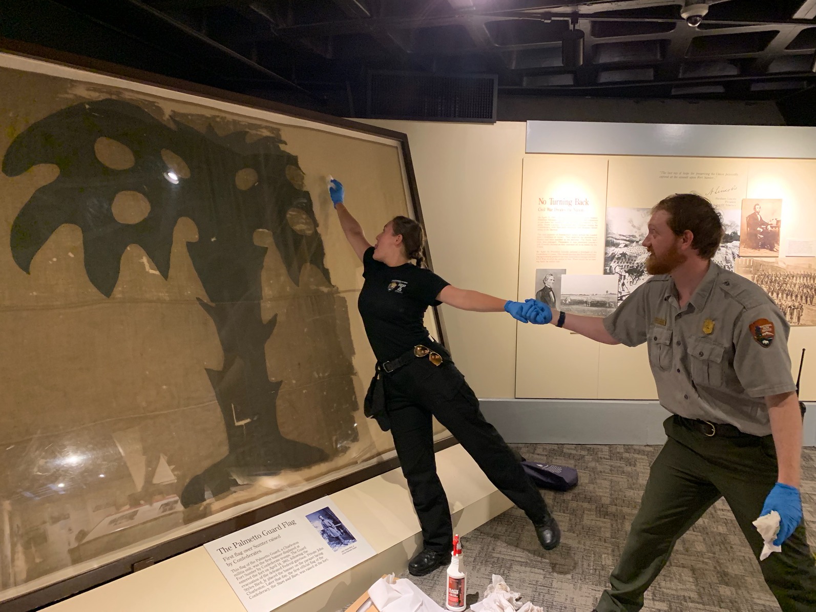 This week began with an impromptu ride out of the boat with the curatorial and maintenance teams. In just a few hours we needed to clean the large flag cases, find a few lock boxes, collect donations, and prepare to renovate the accessible elevator.