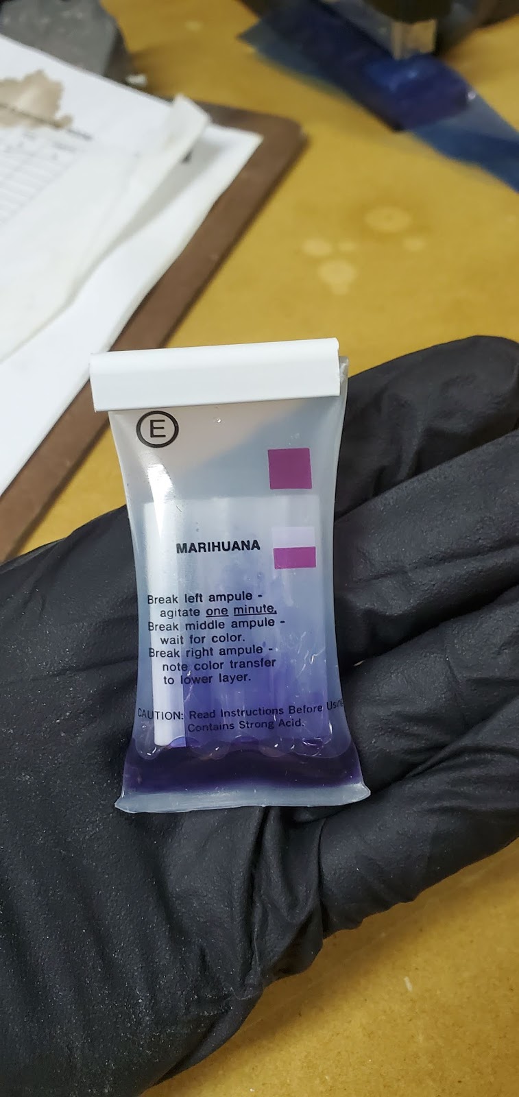 After issuing the driver a written warning, Ranger Clarke and I had to log the seized evidence. This was my first encounter processing evidence, and I learned a lot about the process. First, we brought the substance to the evidence room where all seized items are stored. Once in the evidence room, we proceeded to test the substance for THC. Ranger Clarke walked me through the process of using a field narcotics kit, which officers use to determine if the substance in question is in fact a controlled substance. There are many different test kits for a wide range of controlled substances. However, since we were confident that what we seized was marijuana, we utilized the marijuana test kit. After placing a small amount of the substance into the test kit, I broke one of the small glass vials inside which contains strong acid. The chemical reaction that occurs between the acid in the test kit and the active ingredient in marijuana, THC, changes the color of the solution. After a few minutes, the reaction is complete and a purple color appears if the substance tests positive for THC. In this case, the test was positive for THC as indicated by the dark purple color of the test kit.