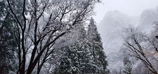 A layer of fresh snow covers the granite cliffs of Yosemite Valley