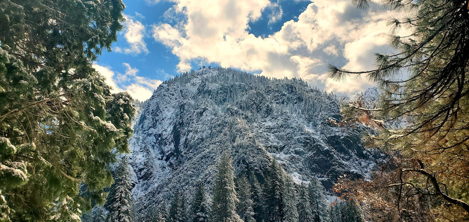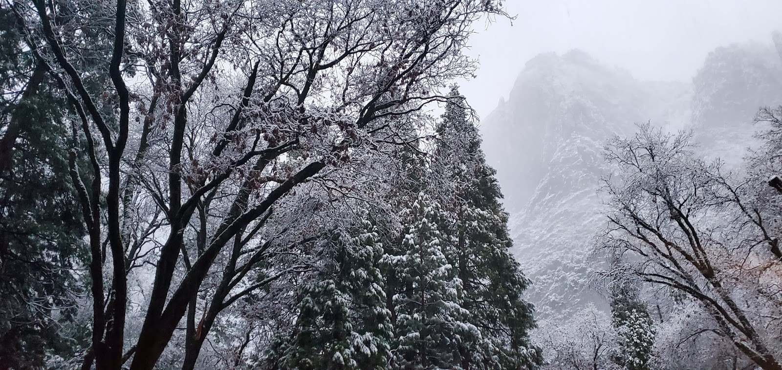 | A layer of fresh snow covers the granite cliffs of Yosemite Valley |