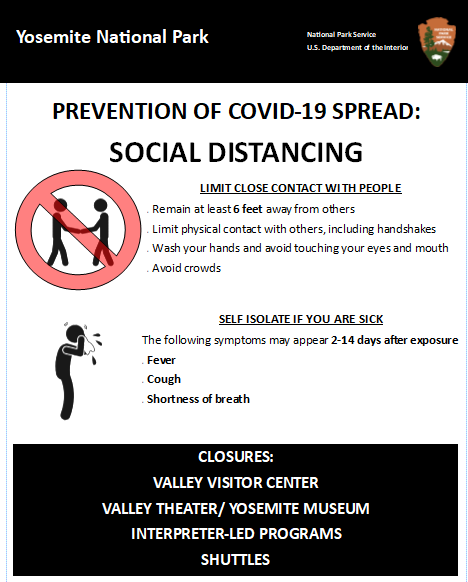 Part of the response to the growing Covid-19 pandemic focuses on social distancing and isolation to reduce exposure. While a majority of park employees are able to perform their duties remotely, there are a number of mission critical employees who, regardless of these precautions, must arrive to work each day and perform their duties. For the law enforcement officers, healthcare professionals, and countless other emergency services personnel in the park, coming to work each day in the face of a global pandemic represents what it means to be a public servant. This week, just as last week, I will continue working on the Valley ambulance and in the Yosemite Medical Clinic responding to emergency calls and caring for those who are sick or injured. While there are currently no reported cases of Covid-19 in Yosemite or the surrounding communities, precautions are in place to protect healthcare professionals and the greater Yosemite community from potential exposure. To aid in this endeavor, I designed some signs promoting social distancing that were placed around the park last week to remind visitors and park employees to practice proper hand washing and adhere to social distancing guidelines.