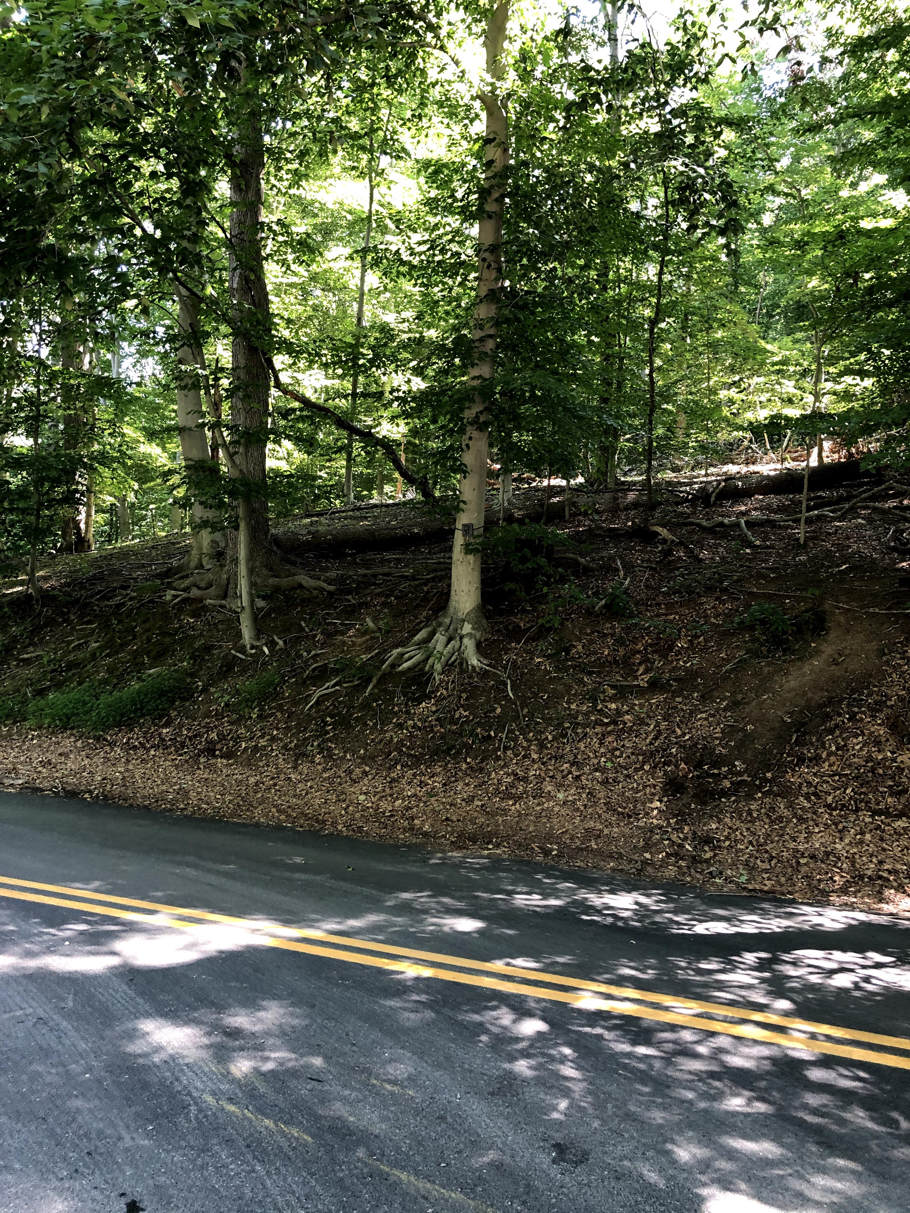 This camera is focused on capturing the license plates of vehicles. If the new sign gets vandalized again, we would have photos of the license plate of the car. This camera on a huge tree and used an extension ladder to position it correctly. I used a 5-inch piece of bark behind the camera to get it on an angle and positioned to capture license plates. Ironically this was the only tree in the area that was on National Park Service property and it was positioned perfect for what I needed to capture license plates.