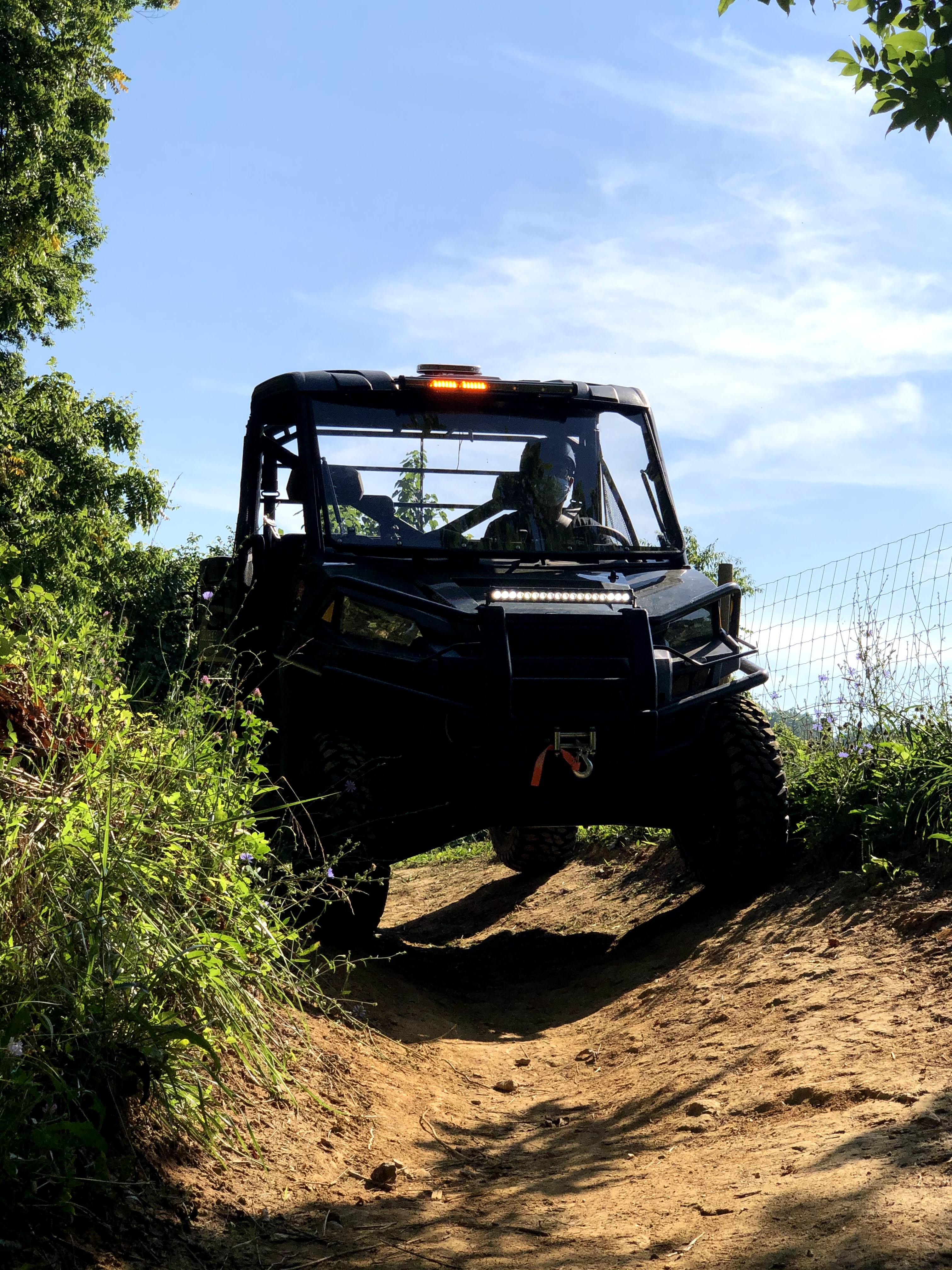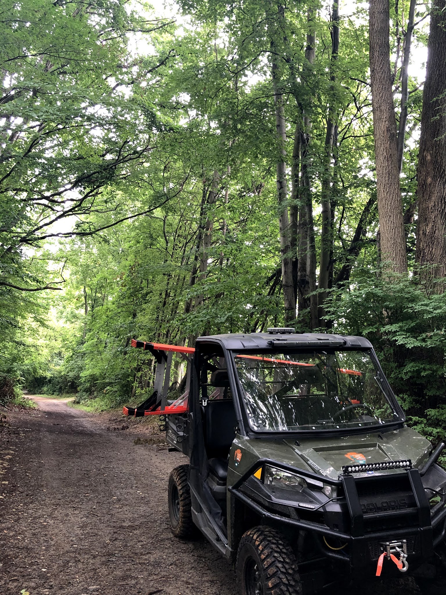 Here is a picture from a greater distance and including the UTV. In this photo, the camera is a little bit above the UTV roof lights. The point of view of this photo to see how the camera is well enough that the general public won’t see the camera unless you are really looking for it. However, this camera is well enough to capture cars and people walking by. Therefore if a car drives by, we have the license plate. Or if people go down this trail with drug paraphilia or other criminal activities we have them on camera too.