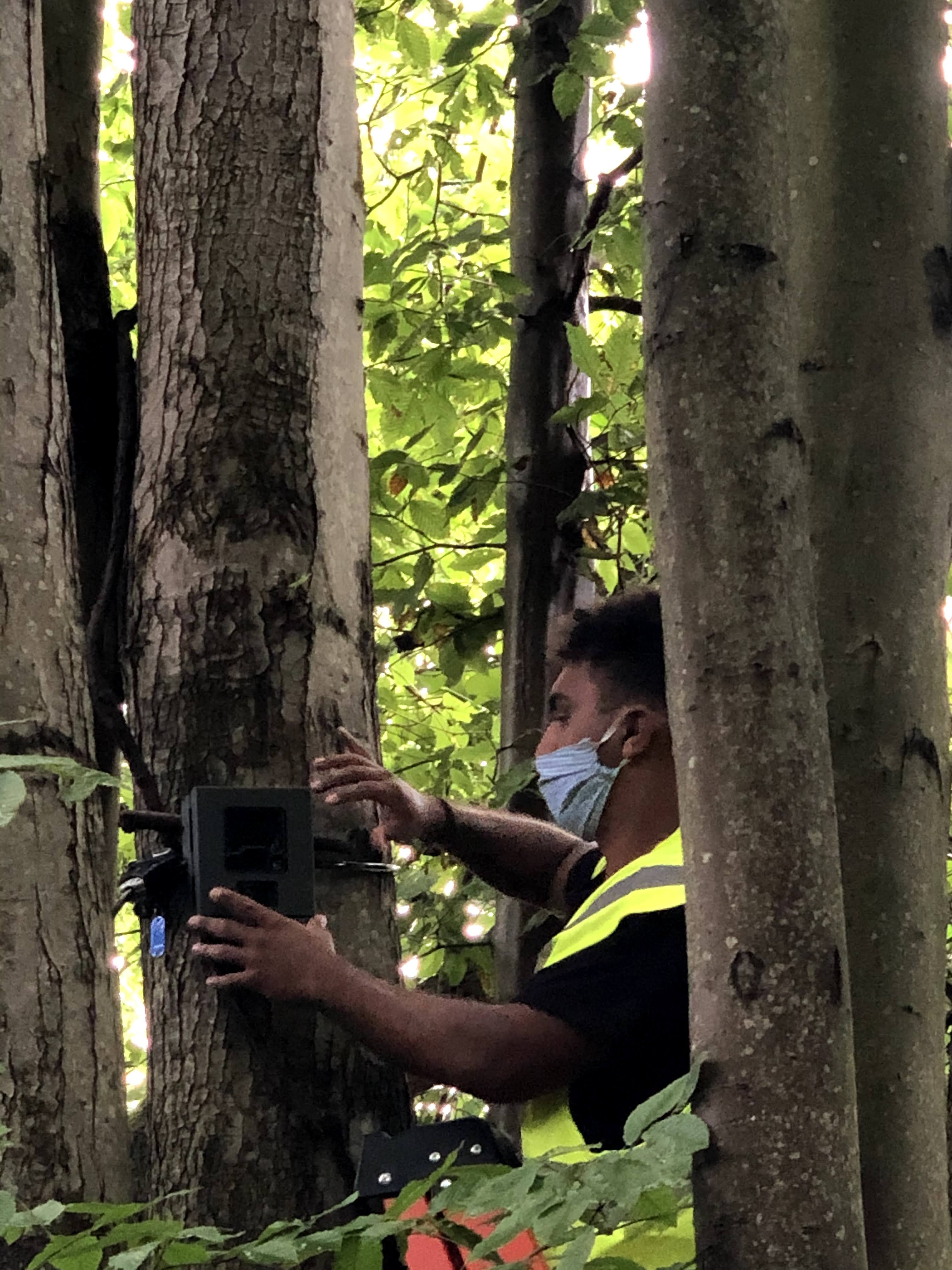 This camera was used to capture unauthorized vehicles and people bringing alcohol on this trail. This trail is considered a hotspot because people would drive their cars down this trail when no cars are allowed back here. However, this camera is not another license plate camera but the general surveillance one. This camera is pointed in the direction cars would need to pass by it. Therefore, it is would be looking at license plates. I also used another piece of bark to position the camera at an angle to capture the photos it would need to get the job done.