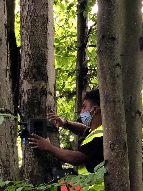 Here is how the camera looks up close and in its final position where I was able to get it right. For this camera, I used a 12-foot ladder to get up on that tree. However, it took a few minutes to actually find the right tree to put the camera on. Ranger Justin and I climbed a couple of trees prior to finding the perfect one. It was trial and error until we got it right.